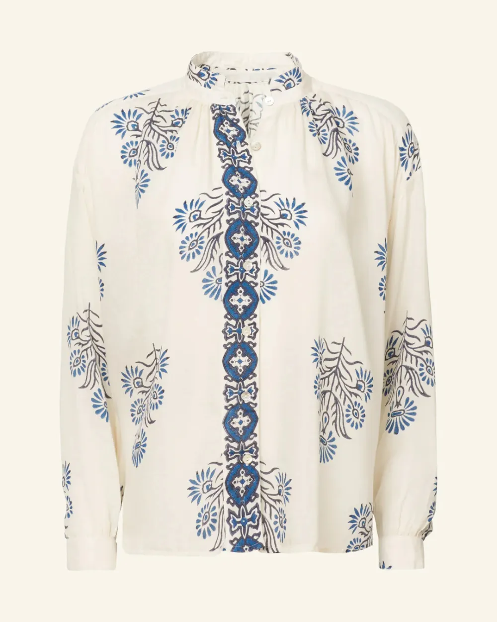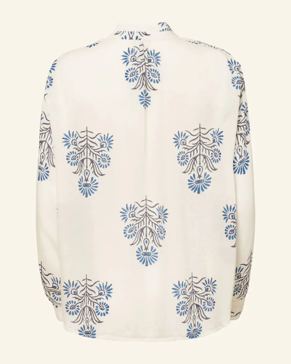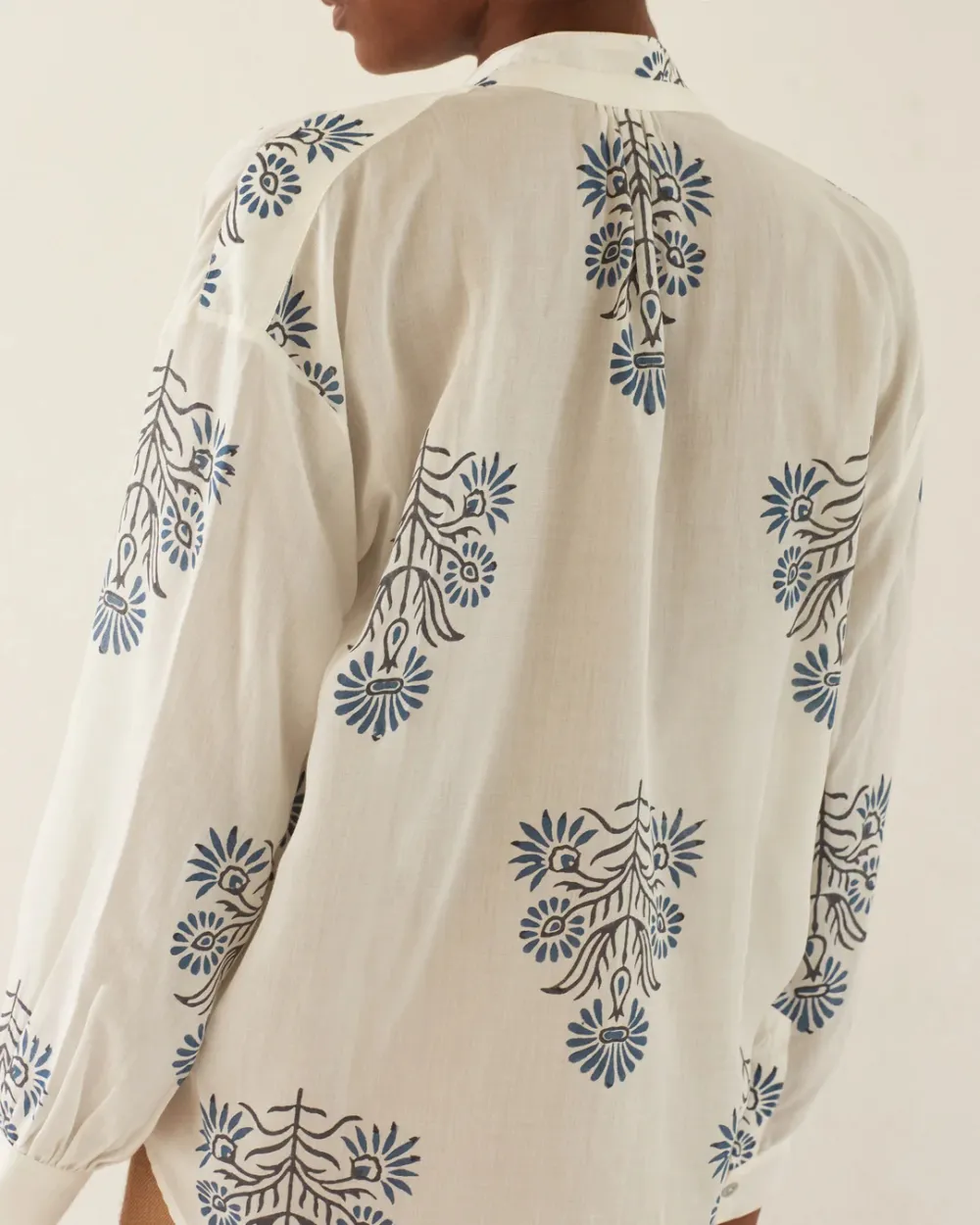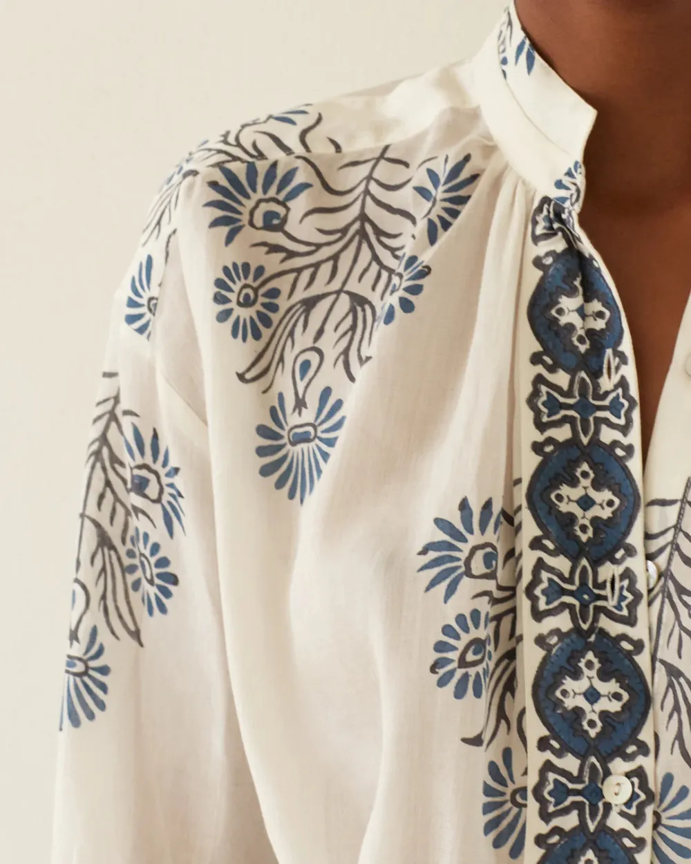 Individually printed and cut by hand, our floral motif shirt has a stand collar, dropped shoulders, and lightly gathered cuffs. Crafted in Tencel, a soft natural fiber with a beautiful drape, the shirt has a medium weight that is great for transitioning into cooler seasons. Works well tucked or untucked, it’s got an easy classic feel.
