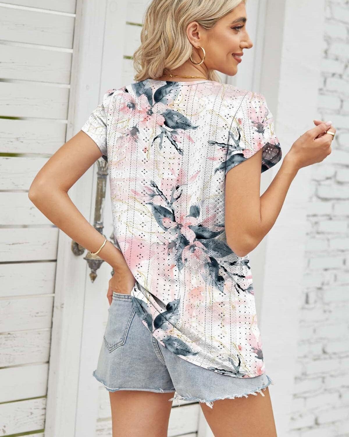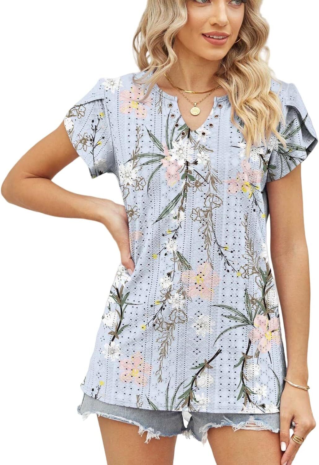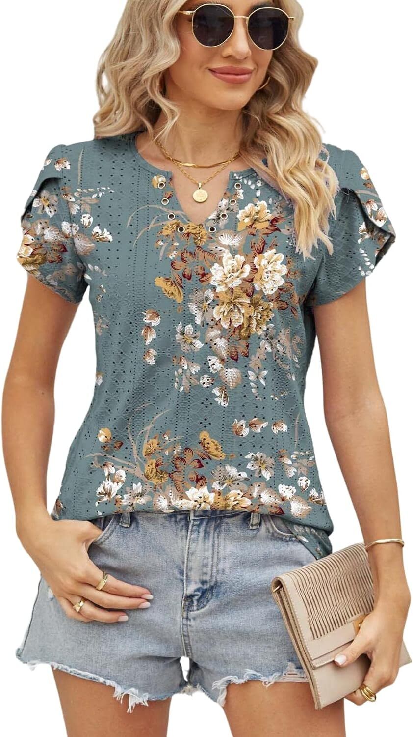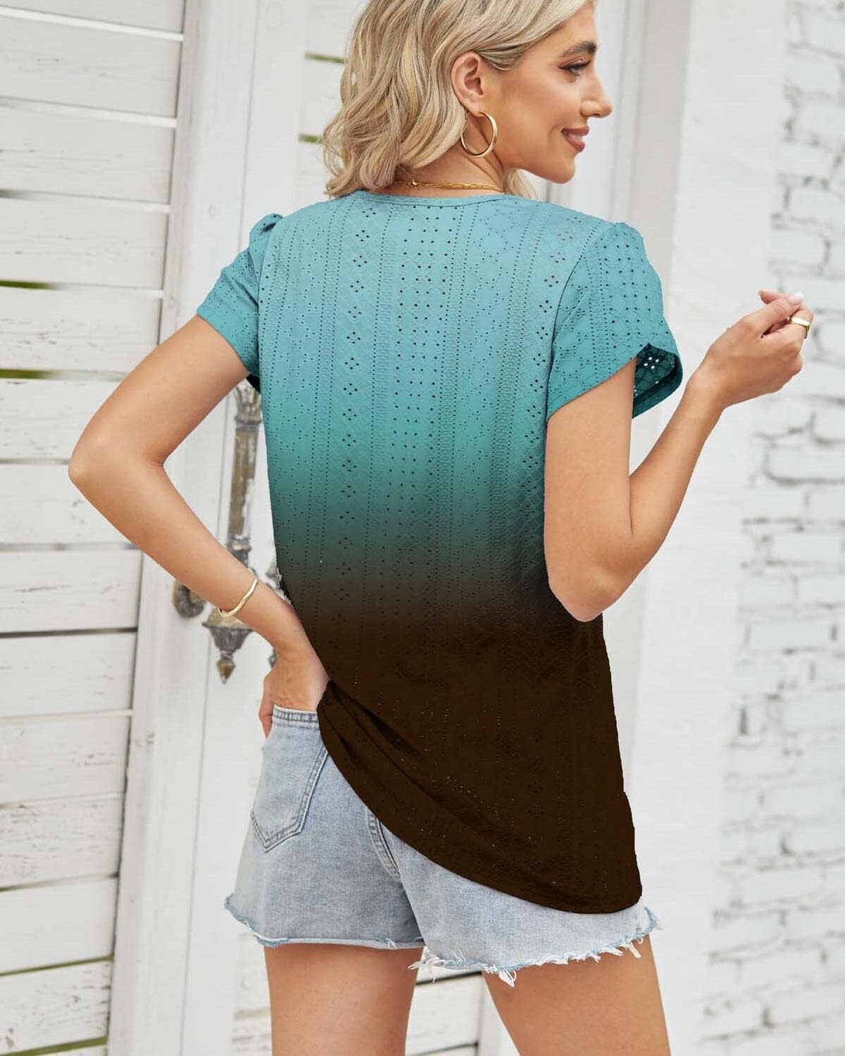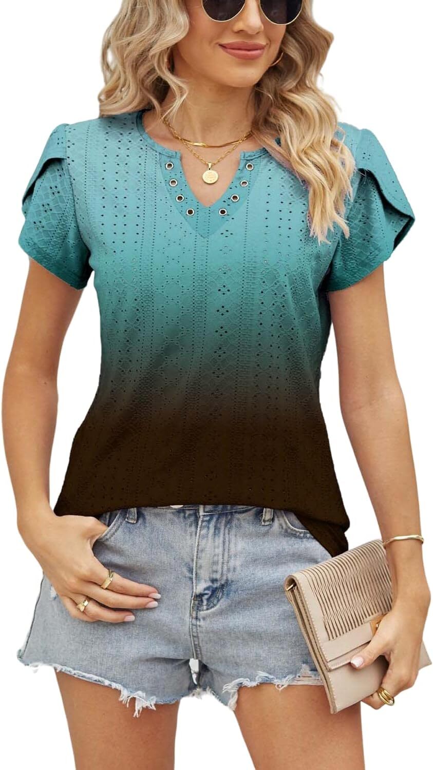 Summer Tops for Women 2023 Trendy Eyelet Petal Short Sleeve Tunic Tops for Women V Neck Casual Loose Fit Shirts for Women Blouse Gradient Tops