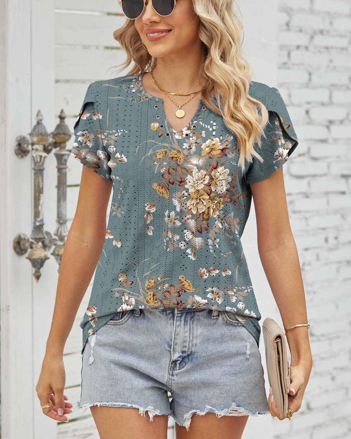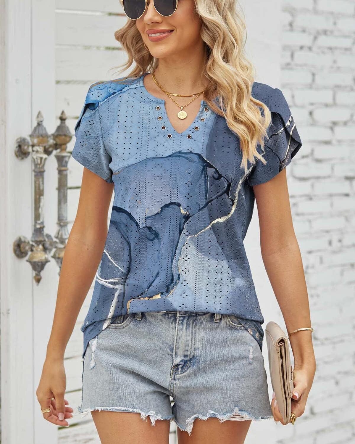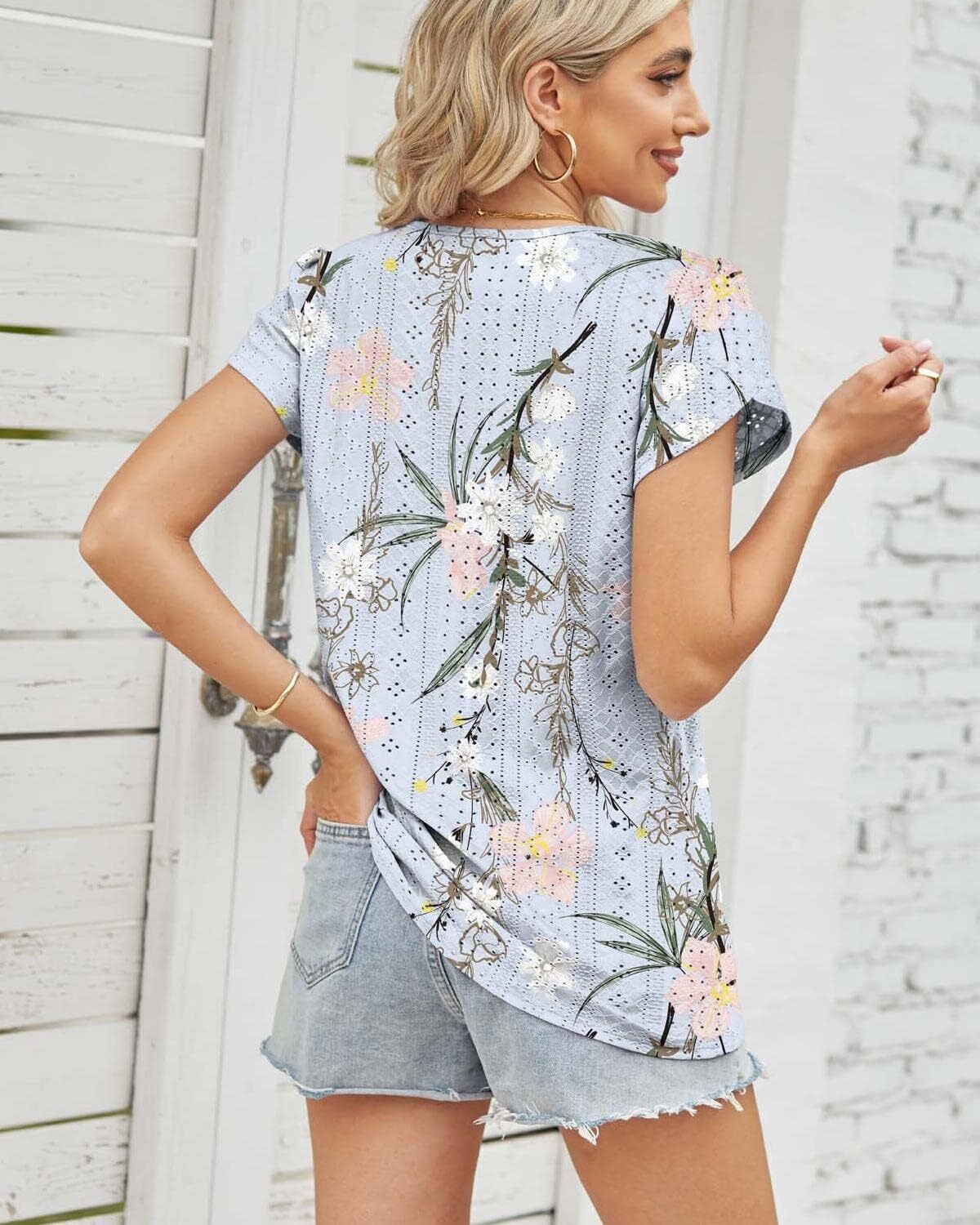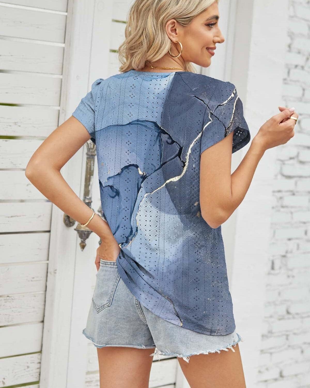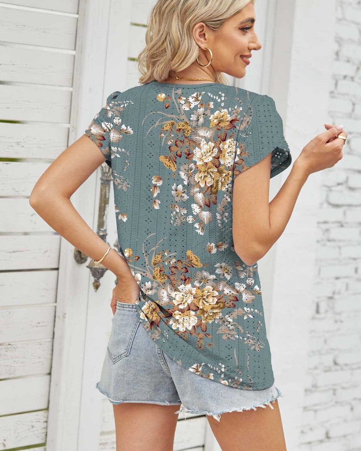 Summer Tops for Women 2023 Trendy Eyelet Petal Short Sleeve Tunic Tops for Women V Neck Casual Loose Fit Shirts for Women Blouse Gradient Tops