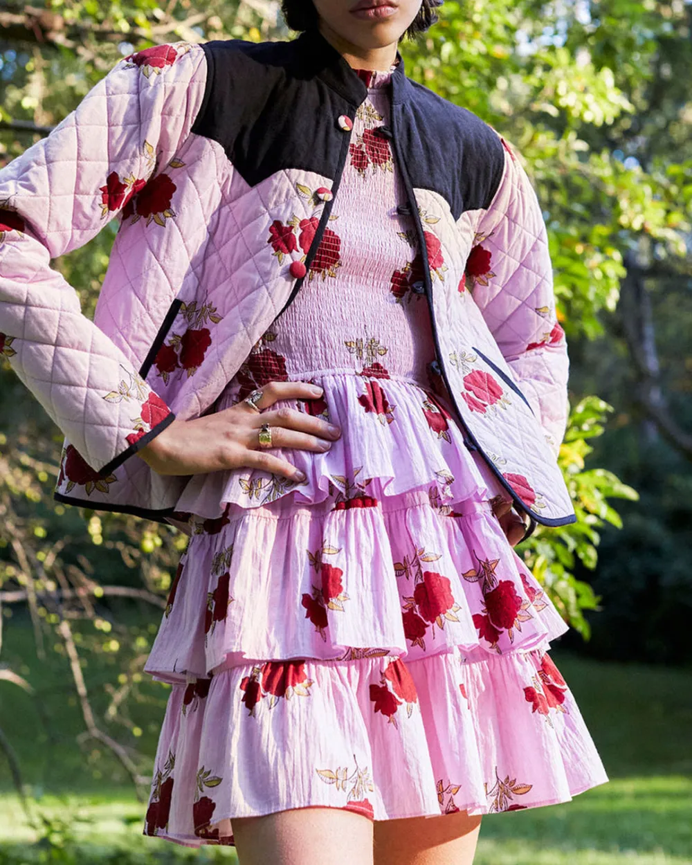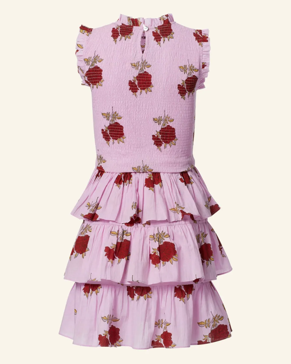 Crafted from cotton voile, our pink rose print mini dress has a smocked bodice, ruffle-tiered skirt, and micro ruffle trim along the neck and armholes. The hand-finished dress is hand-block printed with a floral motif inspired by French chintz.