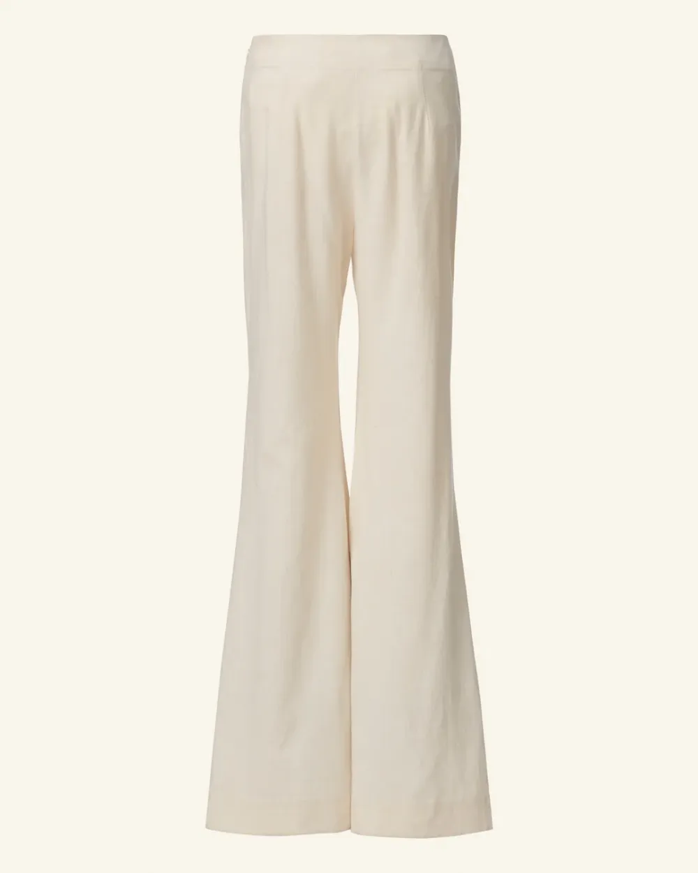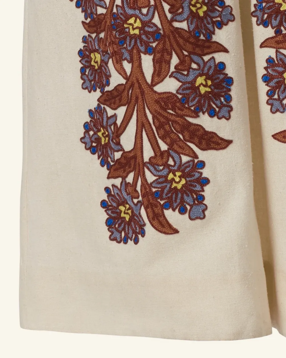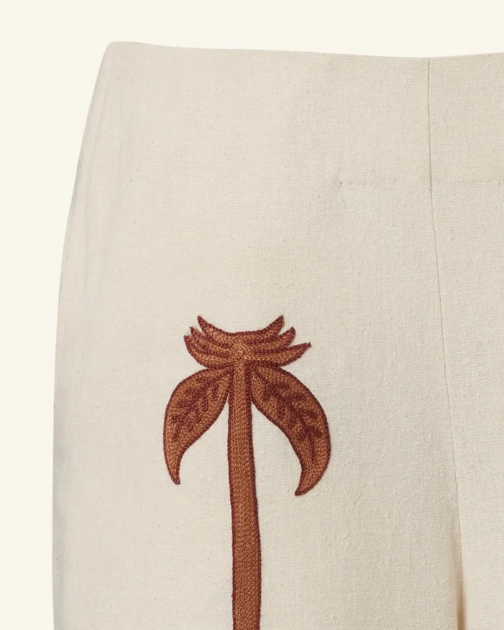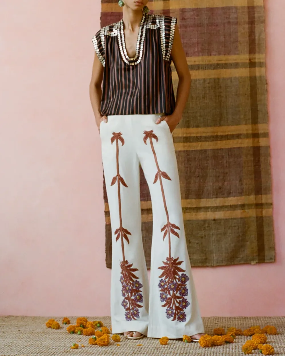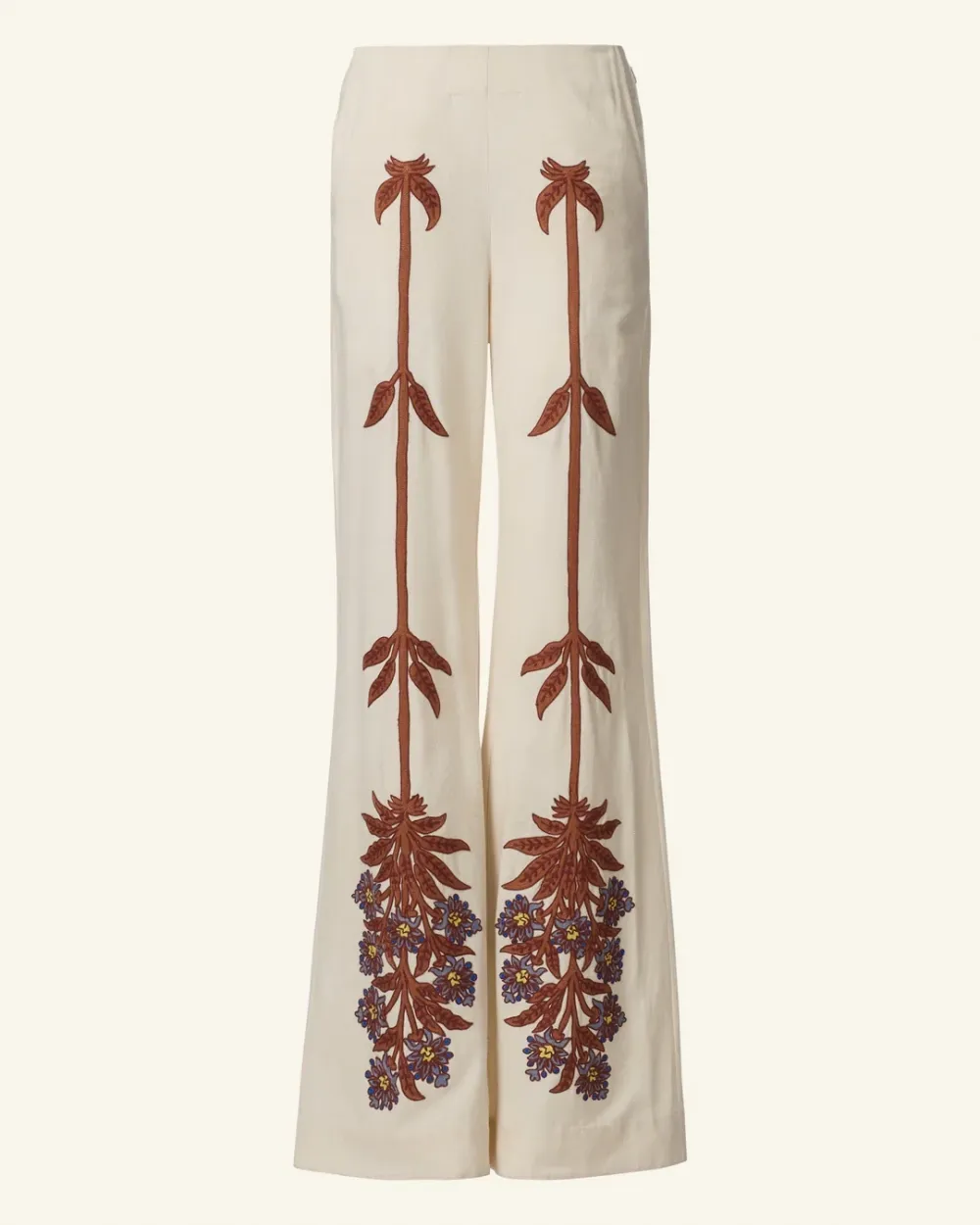 Crafted from slubbed silk, our cream pant is hand-embroidered with a symmetrical floral motif. The silk pant is slim through the hip with a lightly flared leg and side zipper. Finished by hand, the ’70s-style pant has a cotton lining and features our signature falling bloom, newly rendered with a waterlily motif.
