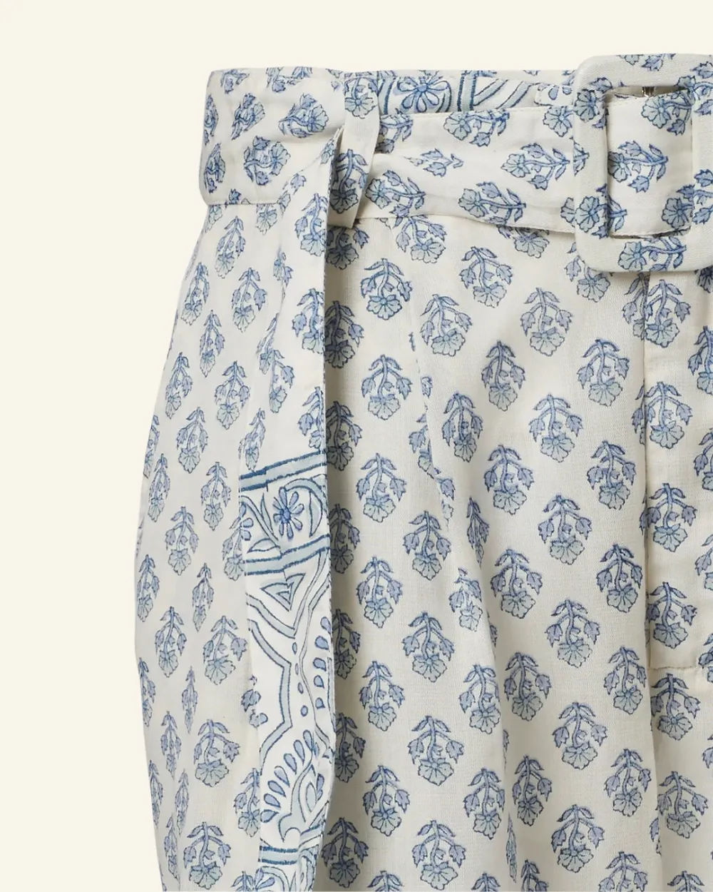 Crafted from Tencel and finished with French seams, our blue floral motif high-waisted pant is lightly pleated with a straight leg silhouette and zip fly closure. The ankle pant is hand-block printed with a Provençal-style print. The soft summer pant has a vintage-inspired feel.