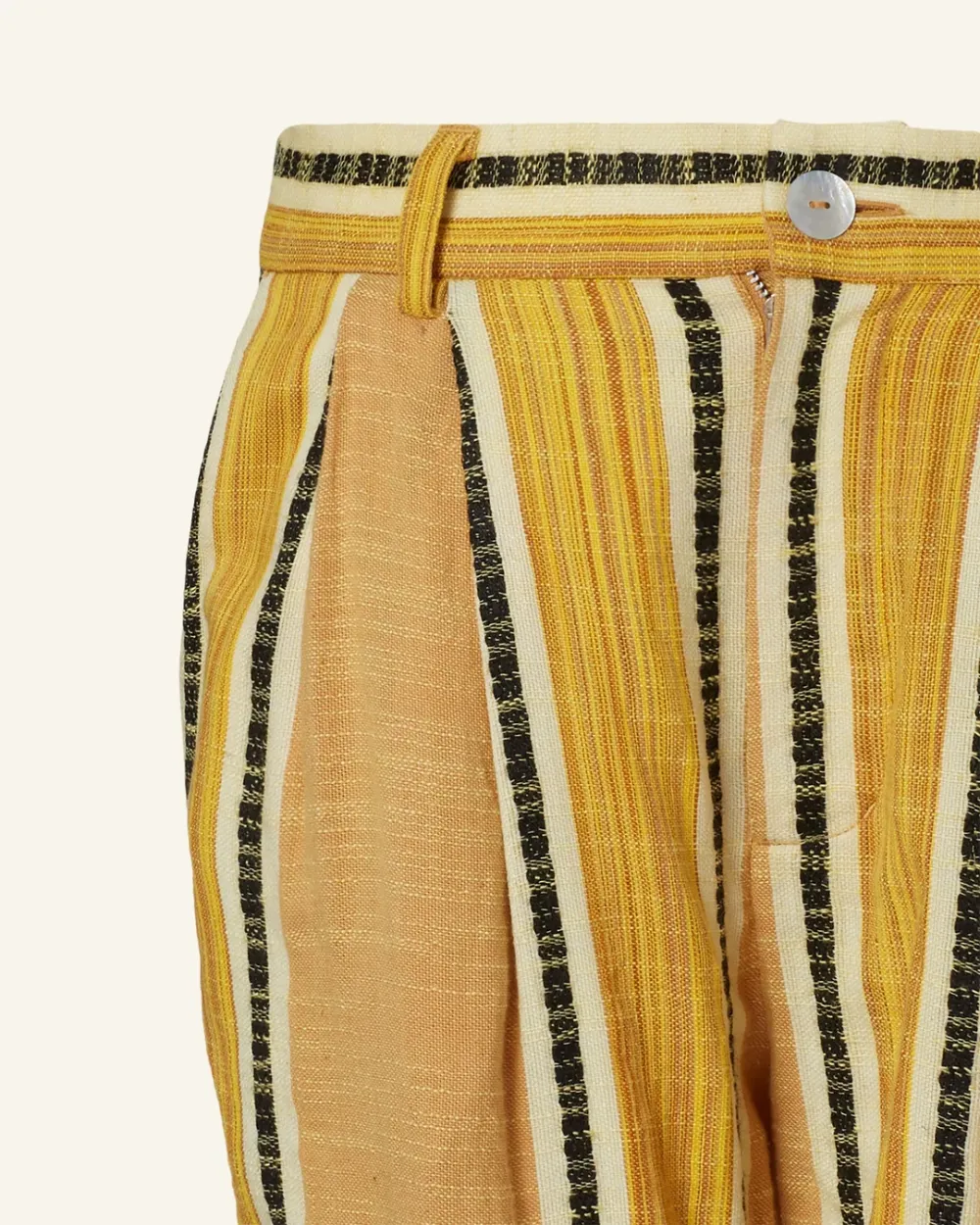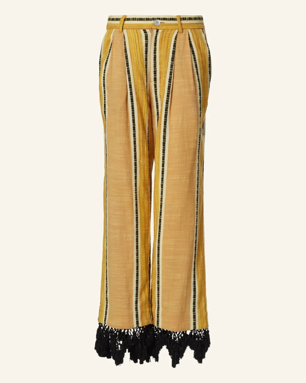 Crafted from hand-loomed cotton, our striped yellow high-waisted pant is lightly pleated with a straight leg silhouette. Trimmed with black cotton fringe like a vintage beach parasol, the summery ankle pant has a seaside feel.
