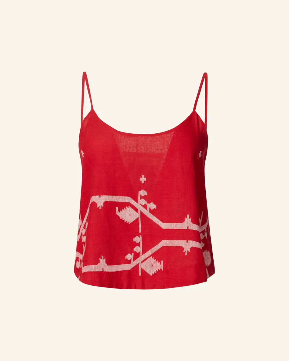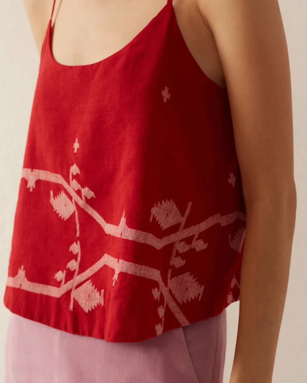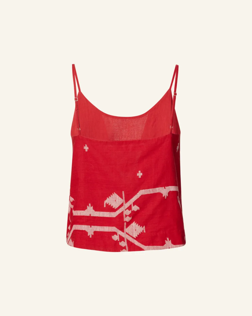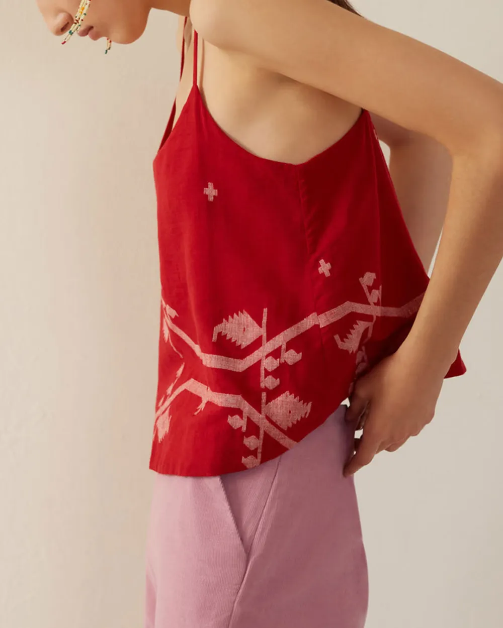 Cut from hand-woven Jamdani cotton, our red camisole is finished with adjustable straps. Jamdani is fine muslin, woven on pit looms with the pattern laid in by hand. So soft and airy, it was called ‘woven air’ or ‘morning dew’ in Mughal times. Great for layering under a blazer or jacket.