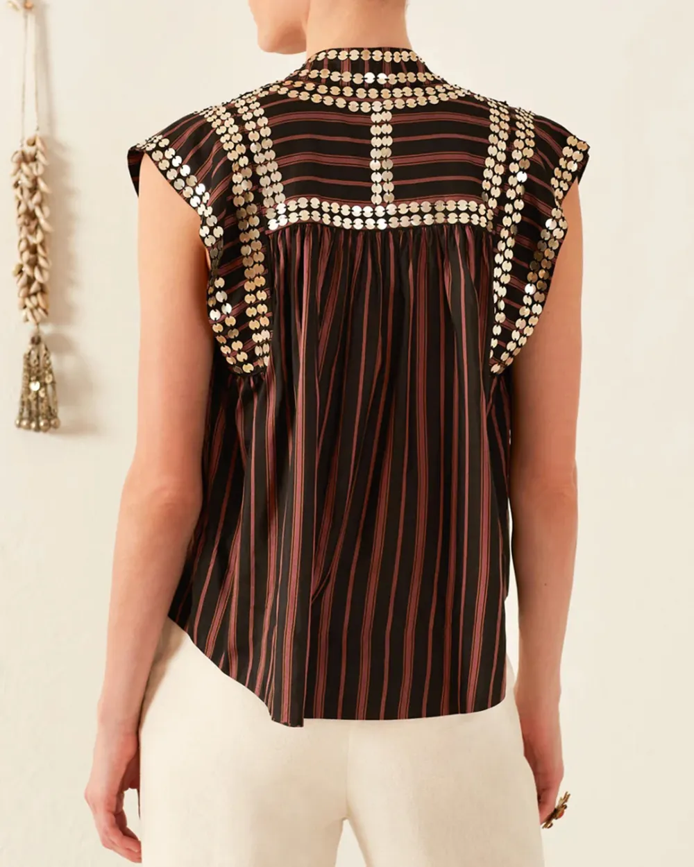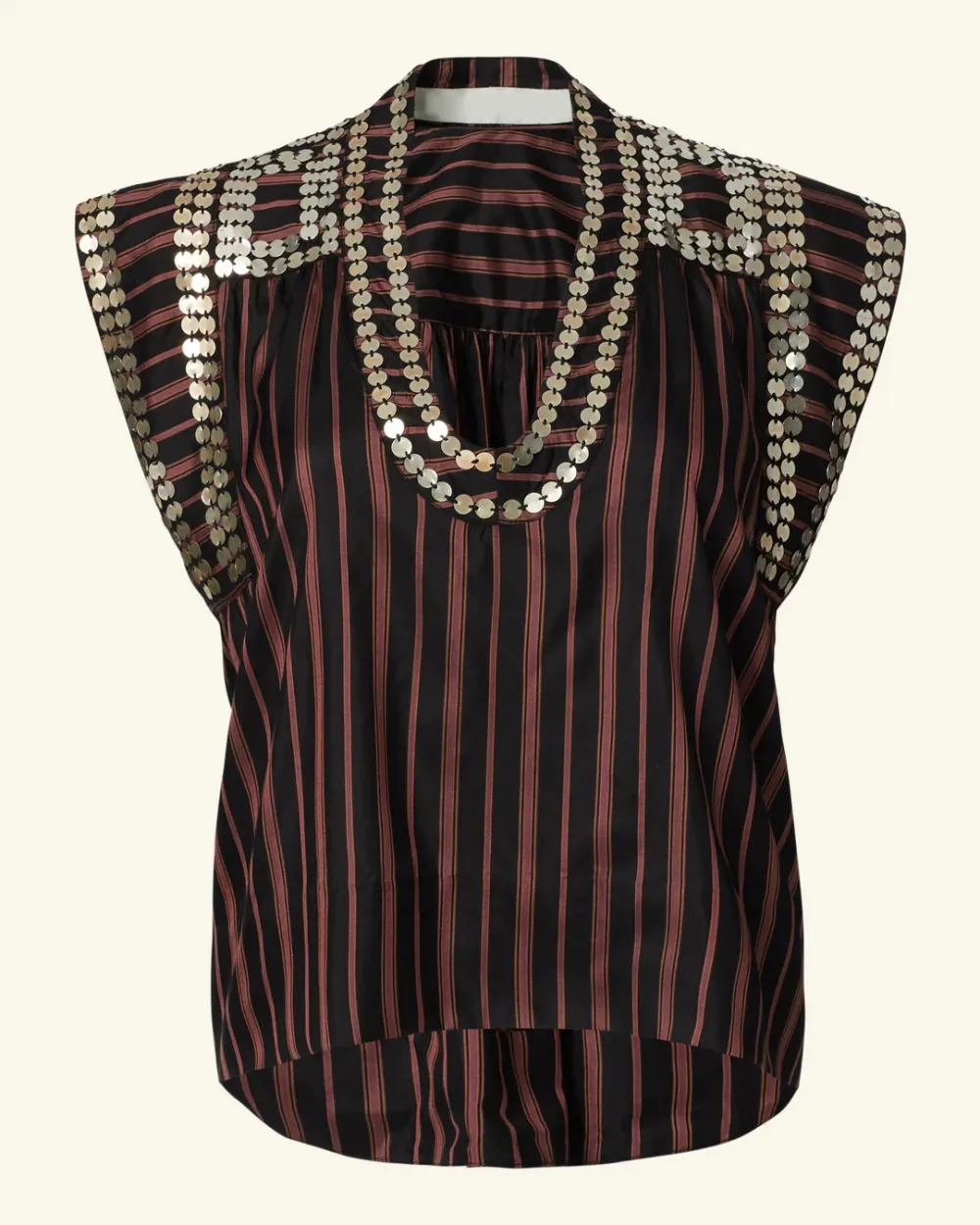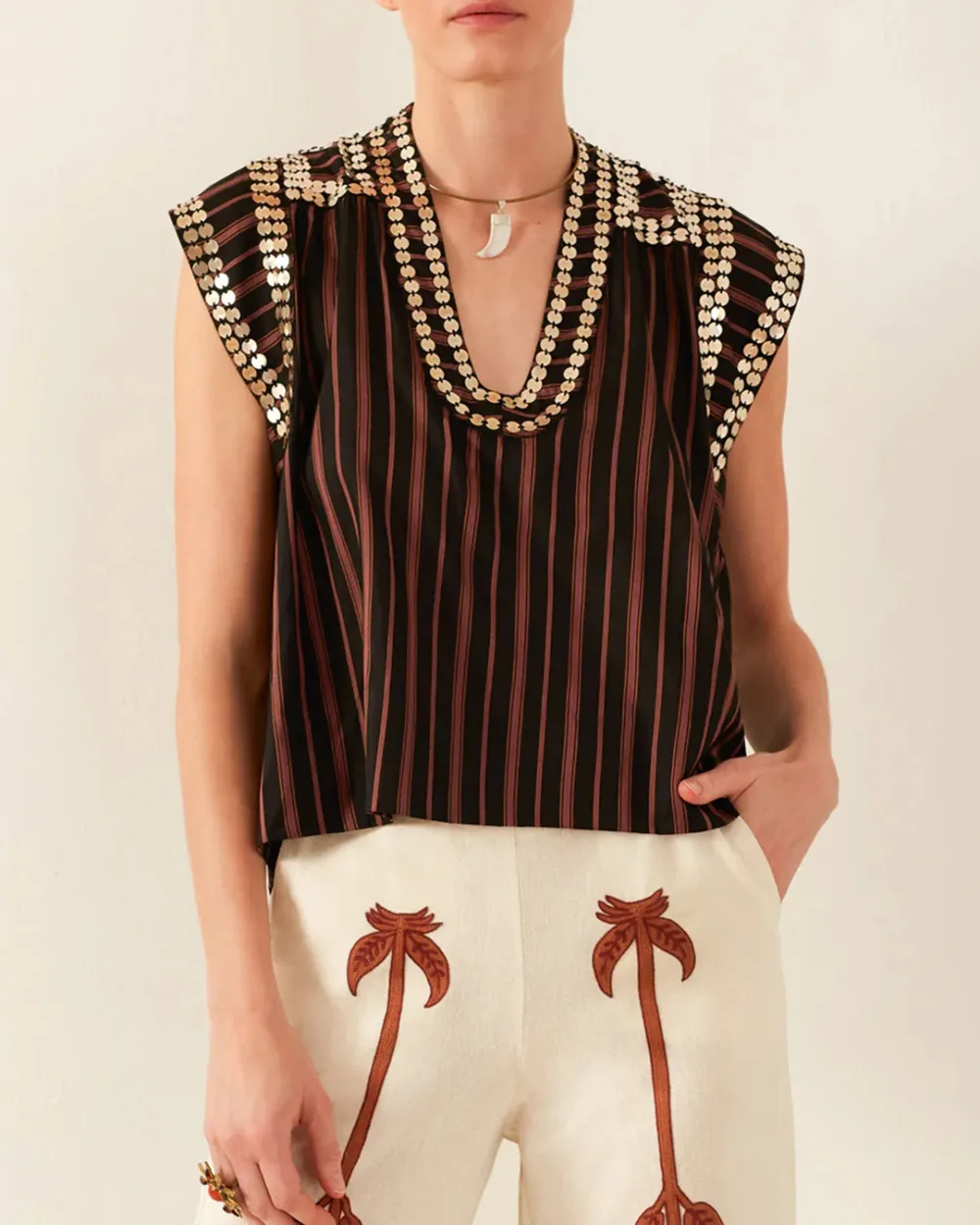 Crafted from Banaras silk, our striped sleeveless top is embellished with hand-stitched silver coins. The vintage-inspired top hits at the hip and can easily go from day to evening.