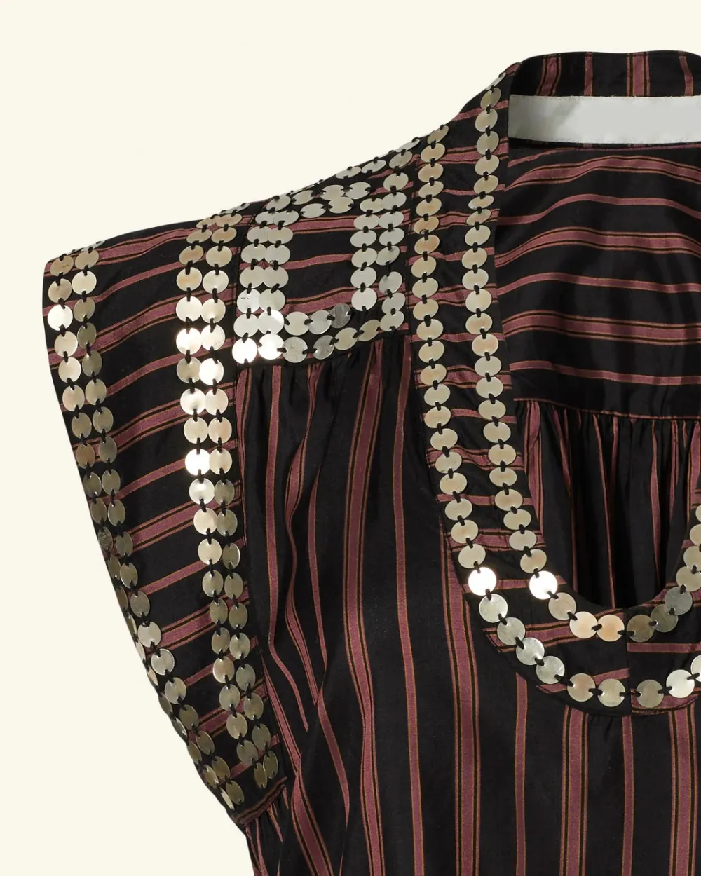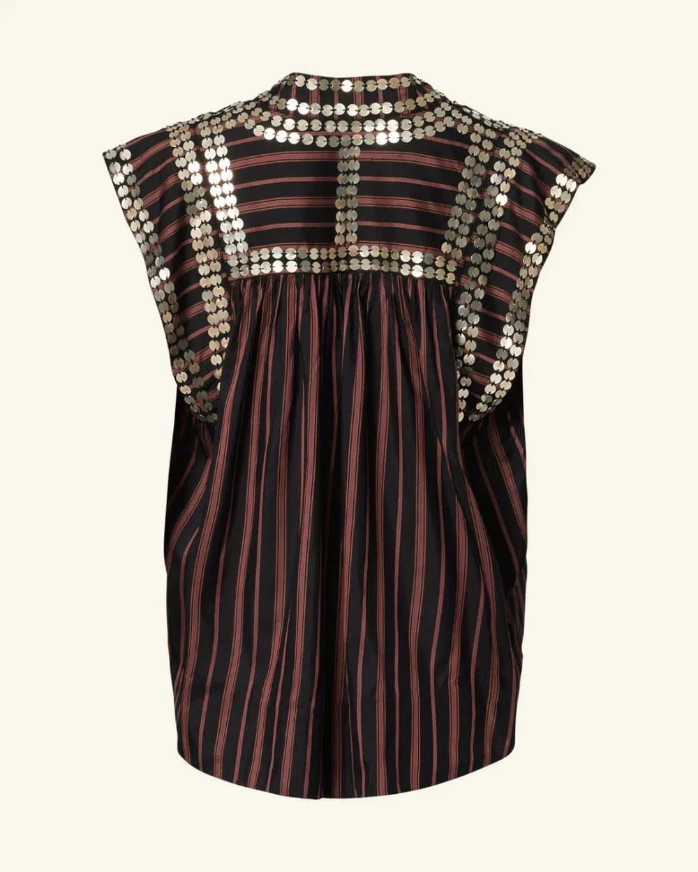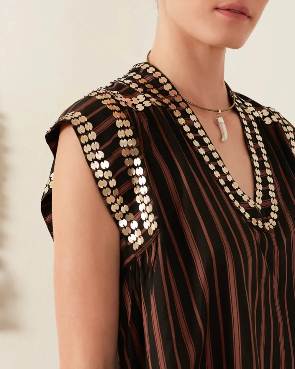 Crafted from Banaras silk, our striped sleeveless top is embellished with hand-stitched silver coins. The vintage-inspired top hits at the hip and can easily go from day to evening.