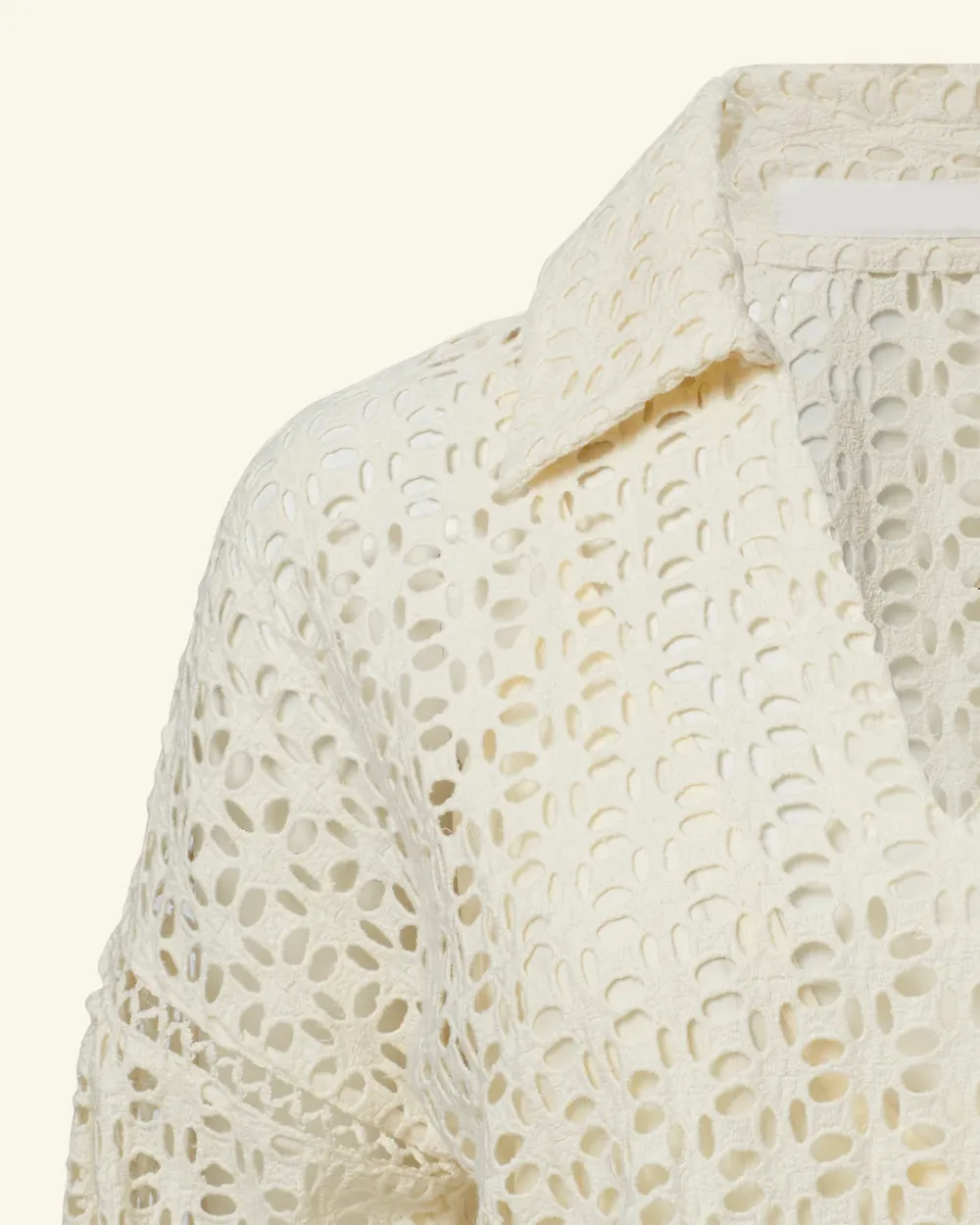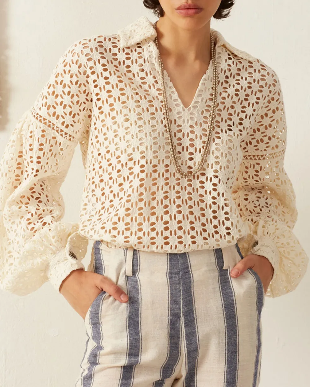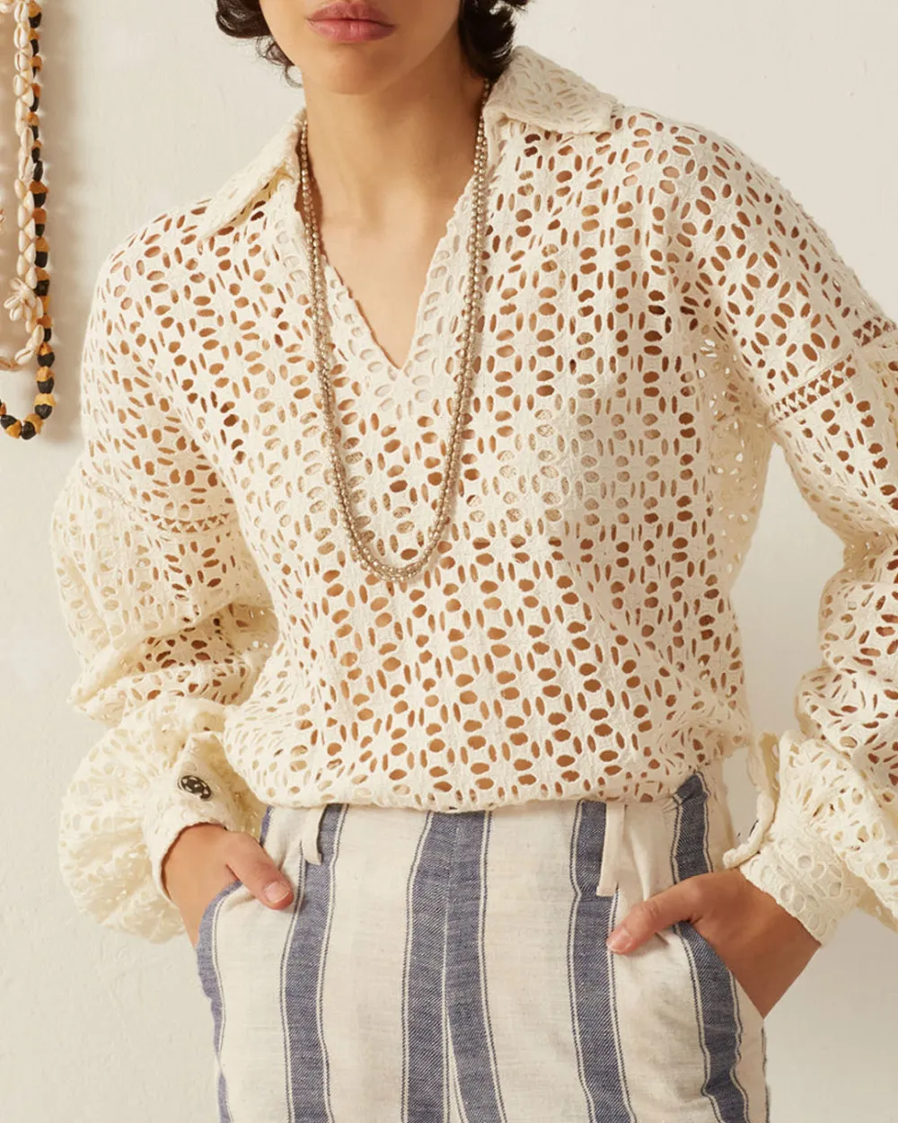 Cut by hand, our ivory eyelet tunic has dropped shoulders, gathered cuffs, and an oversized collar. The vintage-inspired cotton top has handworked fagoting on the seams. Works well as a textural beach cover-up.