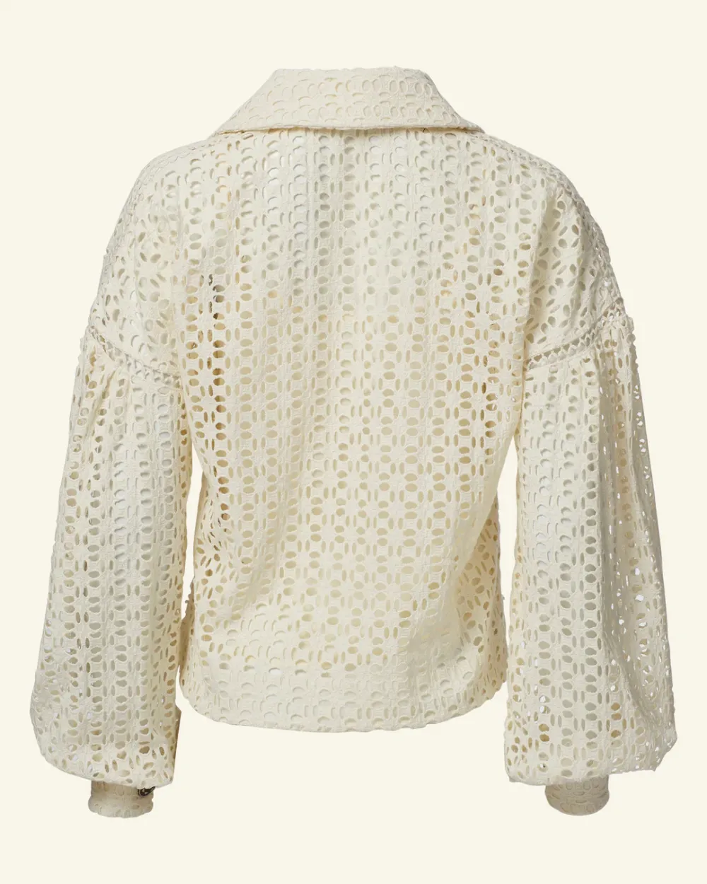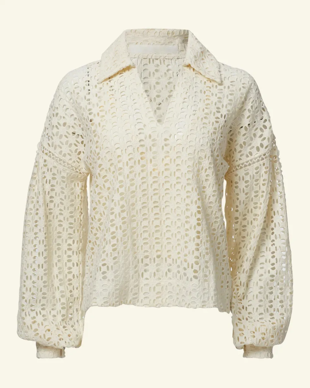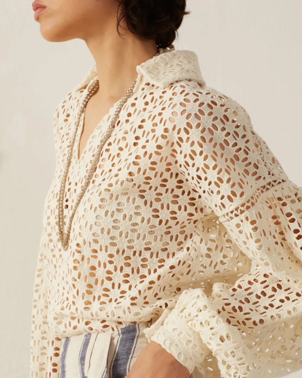 Cut by hand, our ivory eyelet tunic has dropped shoulders, gathered cuffs, and an oversized collar. The vintage-inspired cotton top has handworked fagoting on the seams. Works well as a textural beach cover-up.