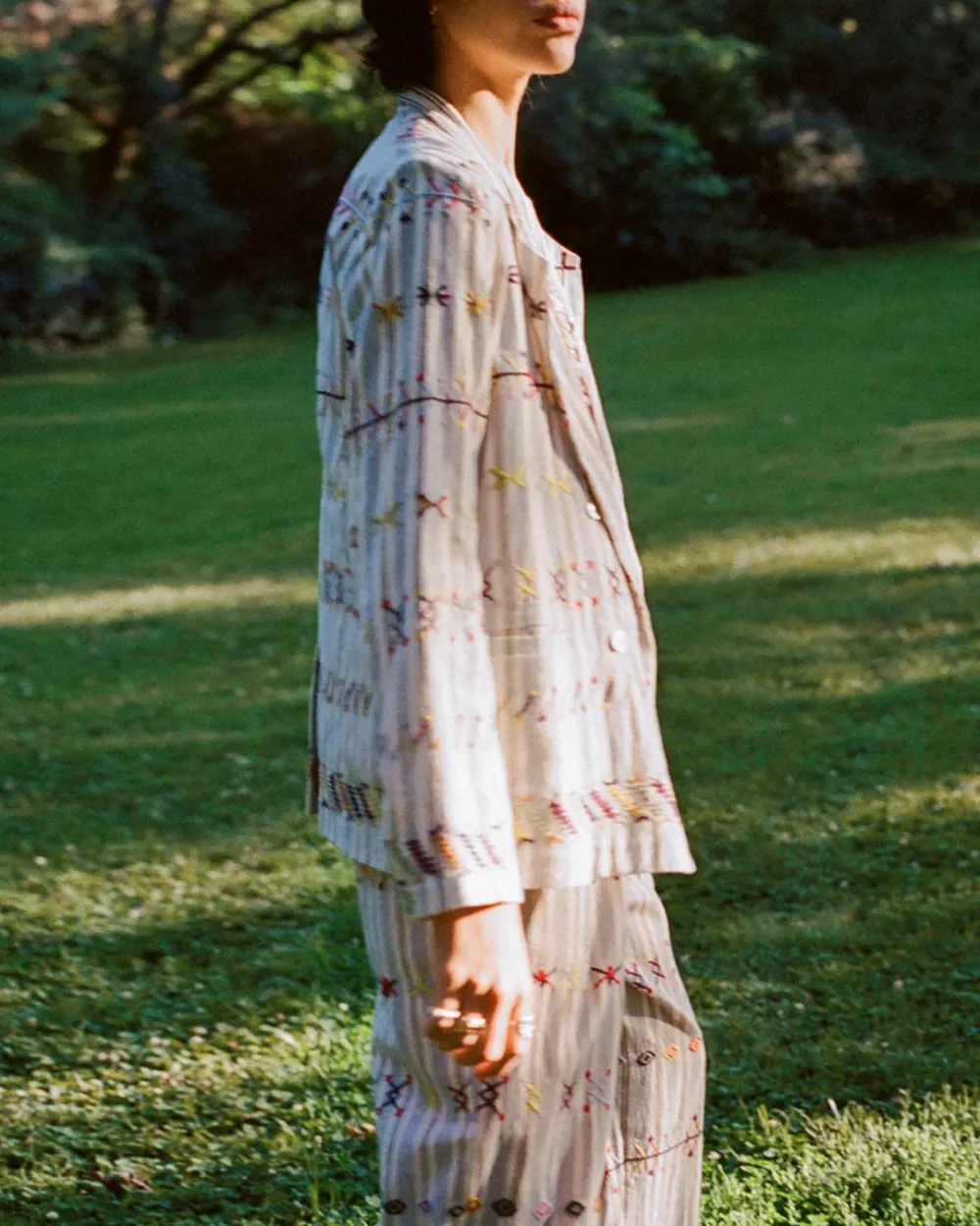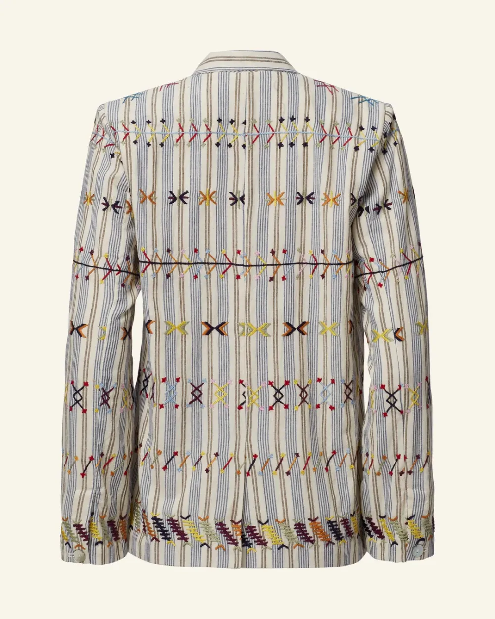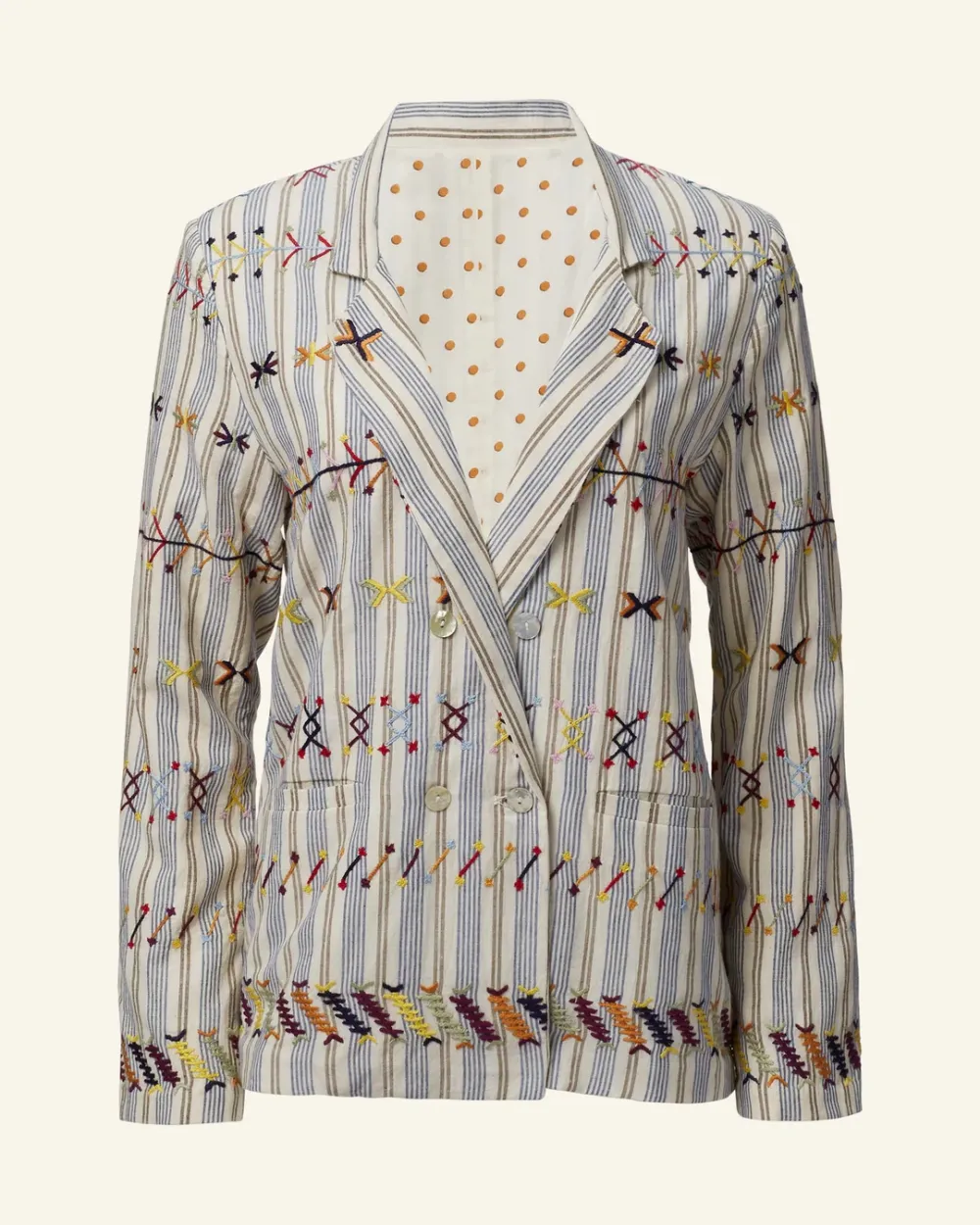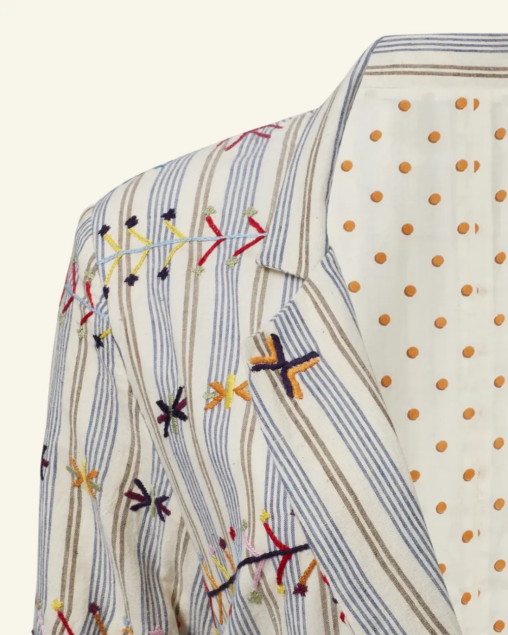 Crafted from hand-loomed Khadi cotton, our double-breasted blazer has a relaxed fit and mother-of-pearl buttons. The blue-and-white striped blazer is hand-embroidered throughout with colorful stitching and lined in a polka print.