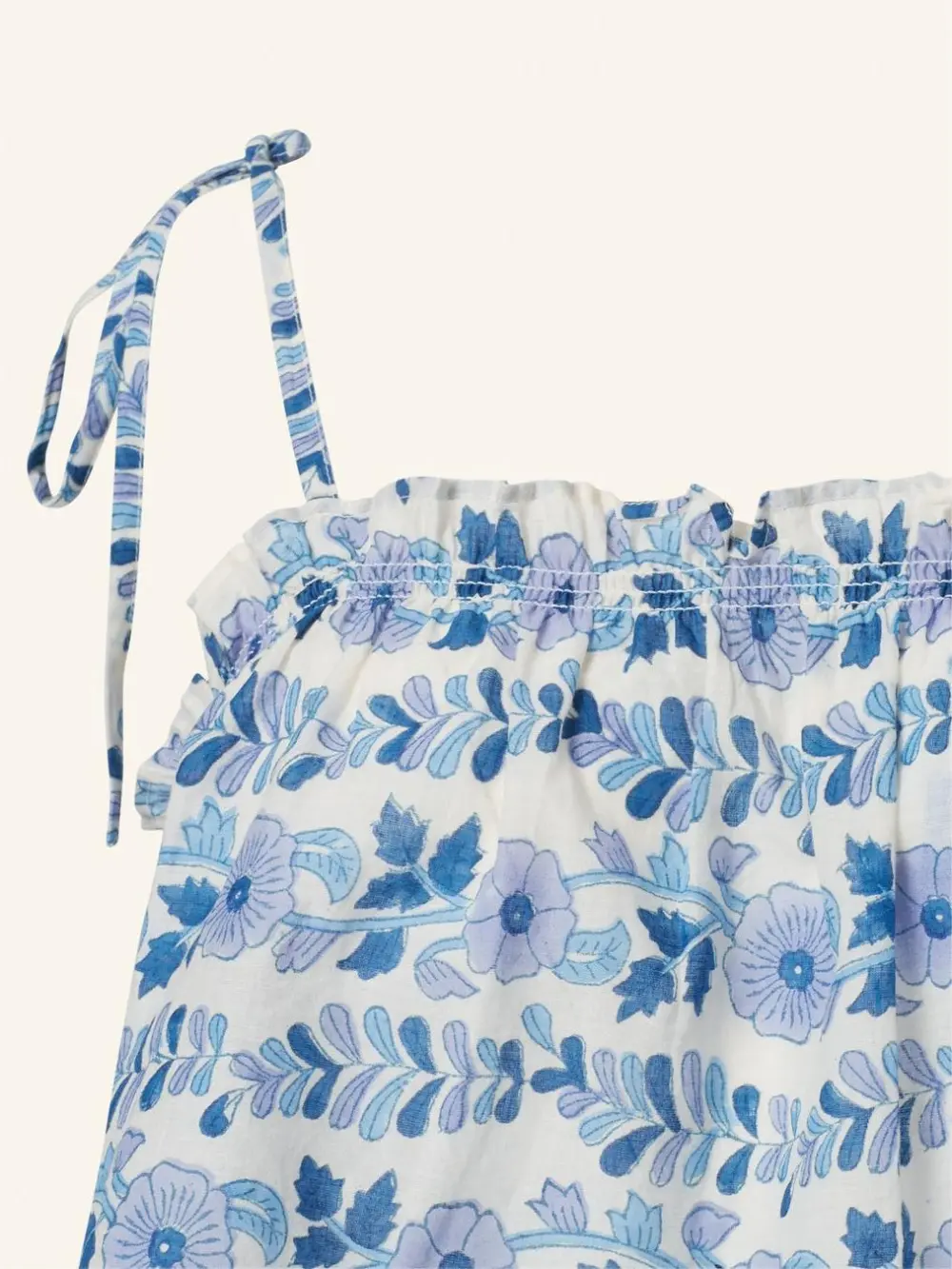 Crafted from a lightweight cotton voile, our blue-and-white floral print sleeveless top has light smocking at the bust, adjustable tie straps, and a loose fit. The vintage-inspired cropped top is hand-block printed with a ’60s-style floral motif.