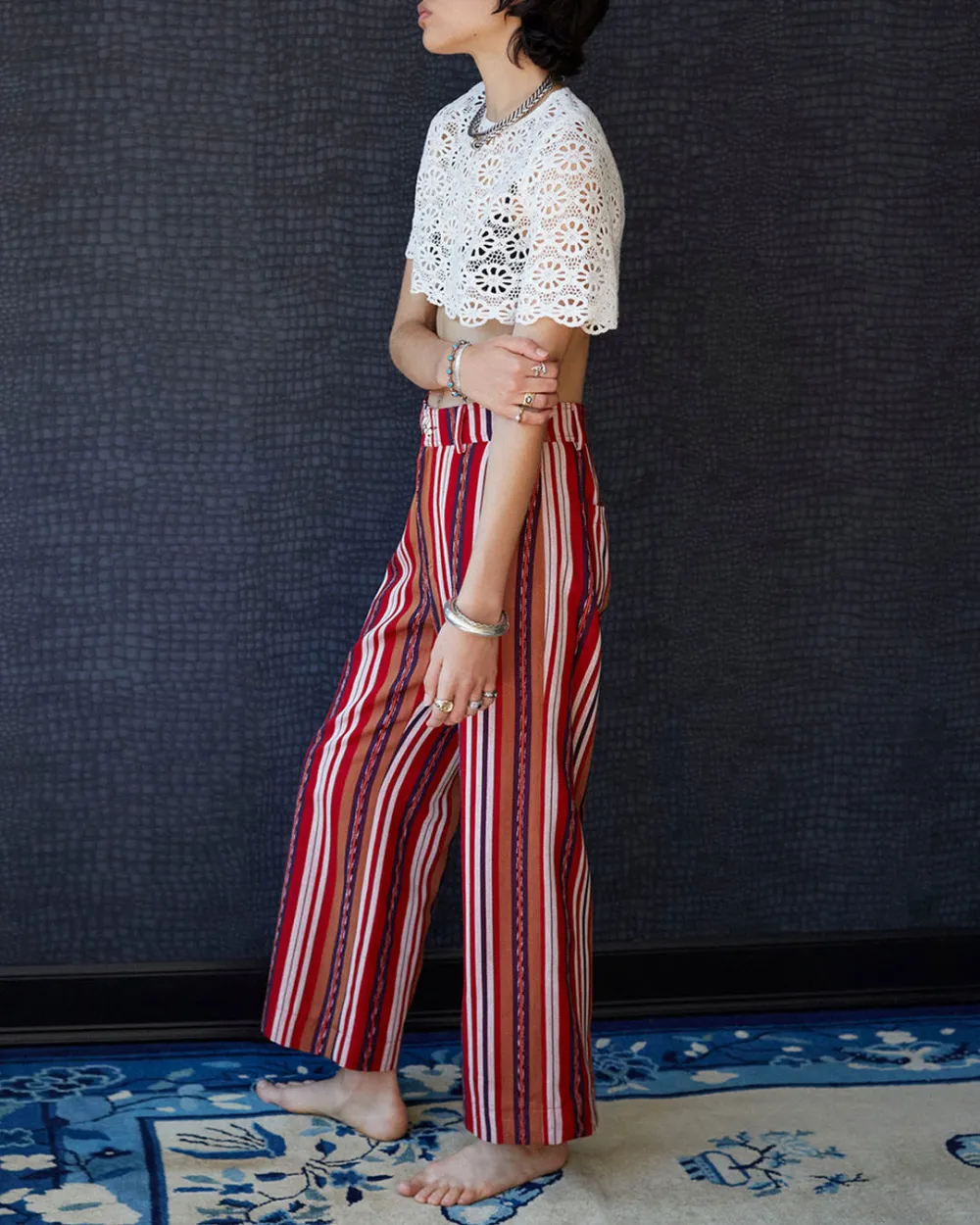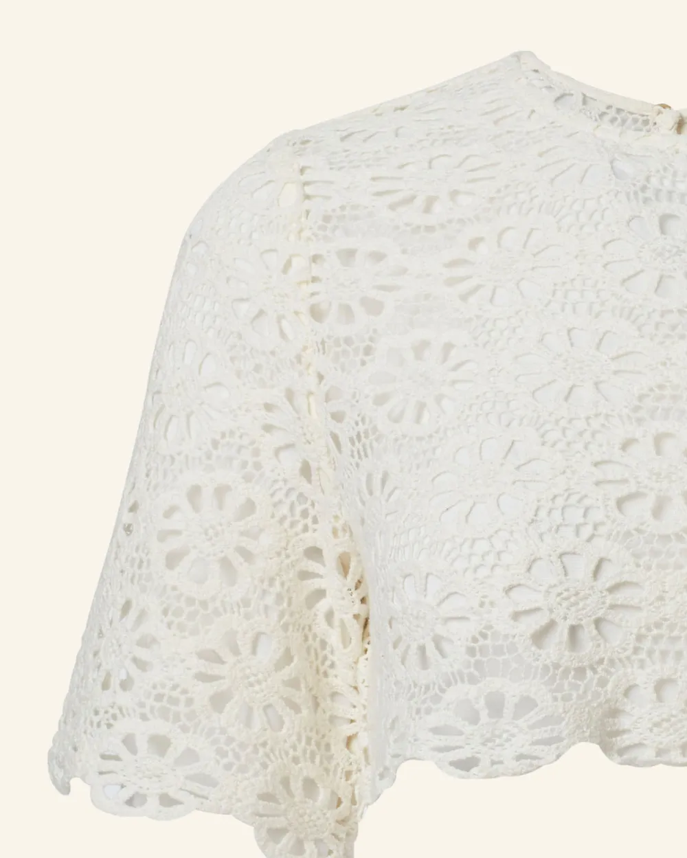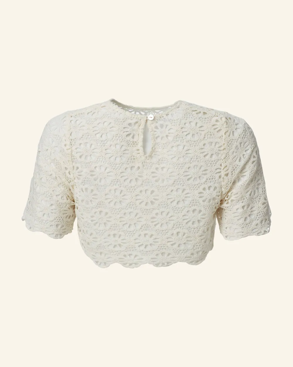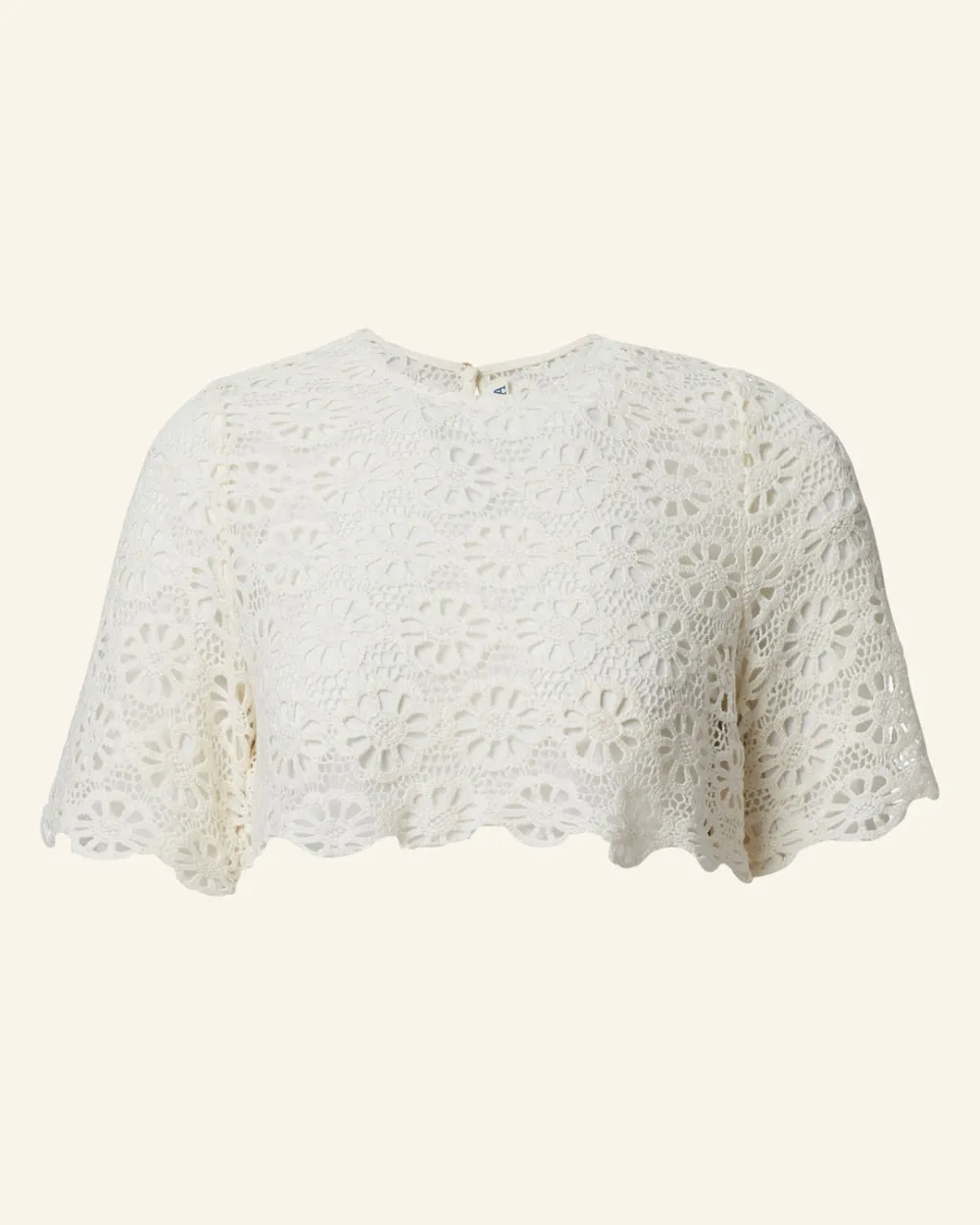 Featuring a vintage-inspired daisy motif, our ivory lace cropped top was inspired by Jane Birkin. The midriff-baring top has a mother-of-pearl button closure at the nape. Can be dressed up or down.