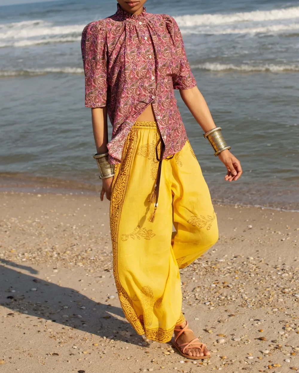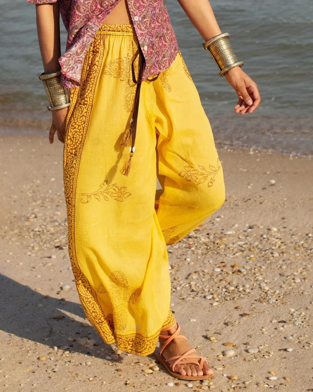 Rendered in block-printed cotton voile, our arabesque print pant has a wide-leg silhouette and an elasticized drawstring waist finished with cowrie shells and tassels. The lightweight pant has a semi-sheer texture that is great for warmer weather.