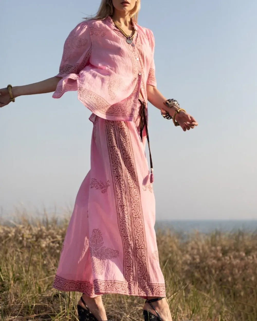 This one-of-a-kind textile was block-printed by hand. Subtle printing and dye variations are part of the unique beauty of the garment and a signature of the artisan’s hand.