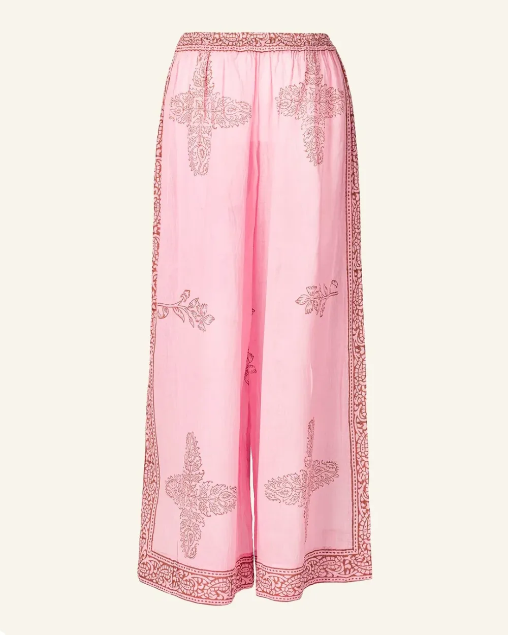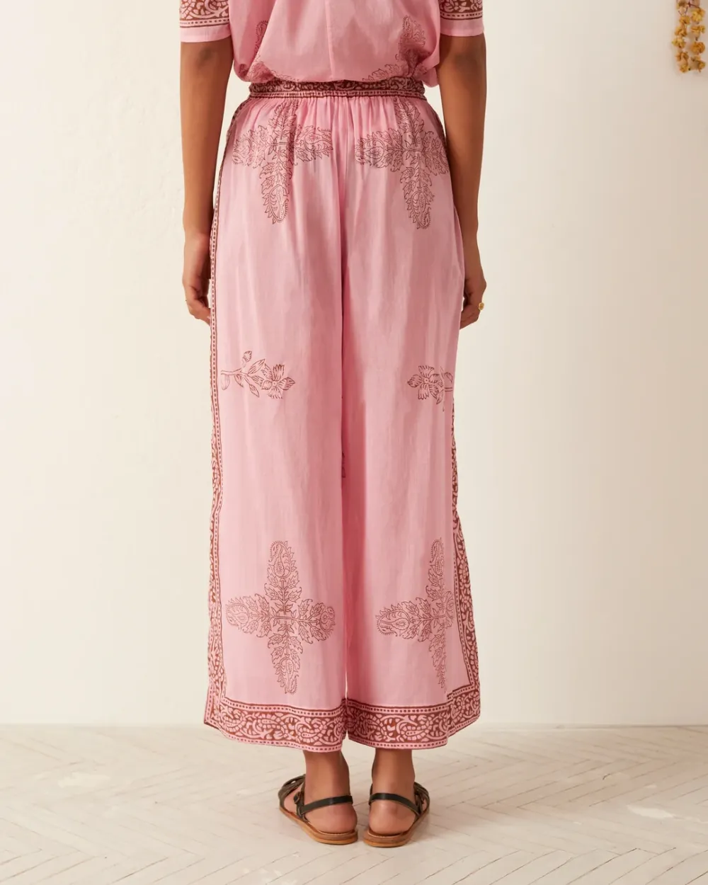 Rendered in block-printed cotton voile, our arabesque print pant has a wide-leg silhouette and an elasticized drawstring waist finished with cowrie shells and tassels. The lightweight pant has a semi-sheer texture that is great for warmer weather.