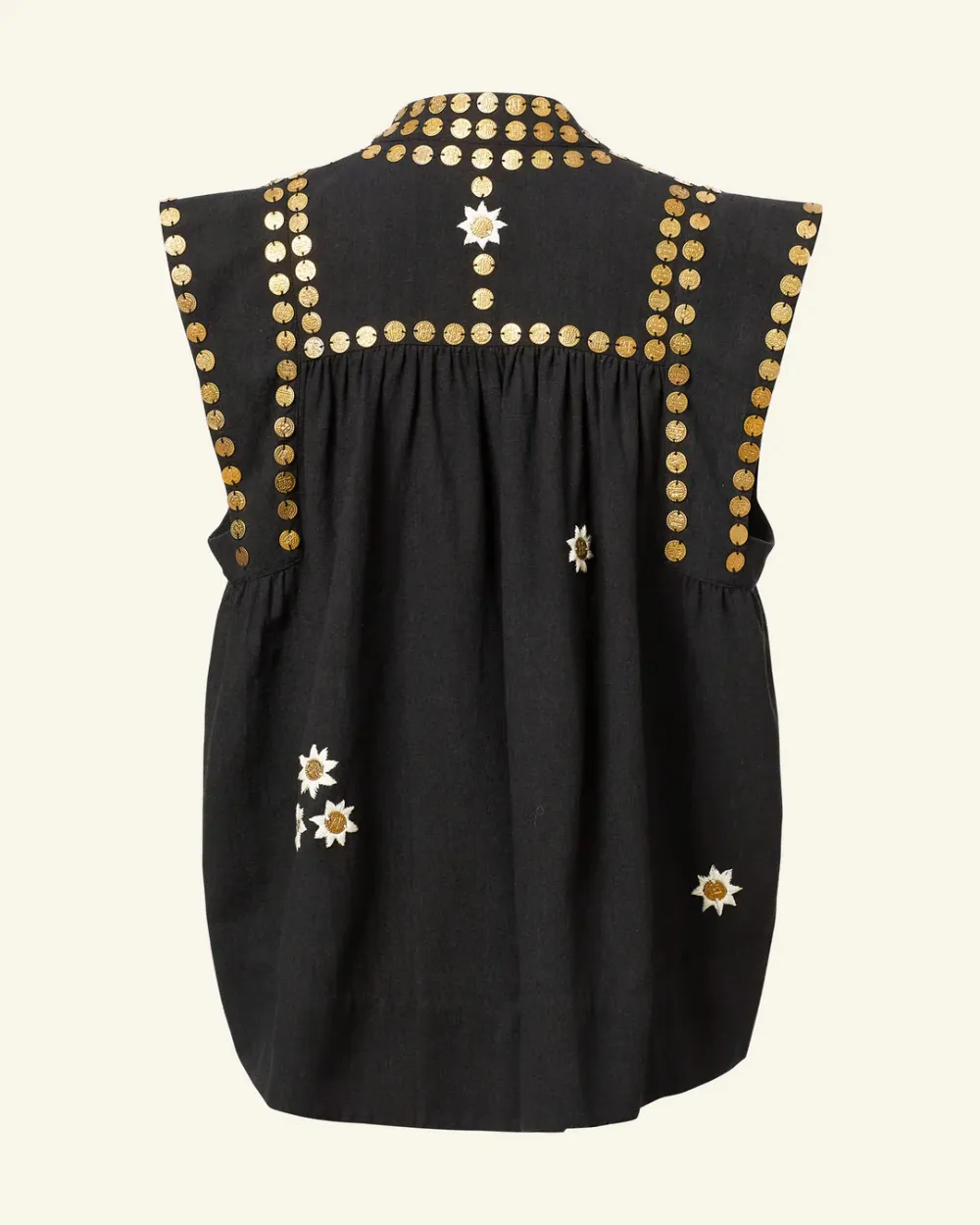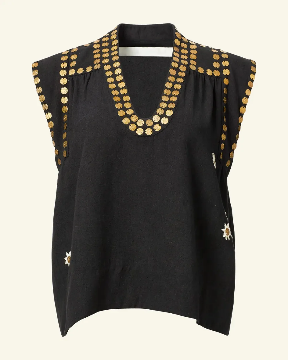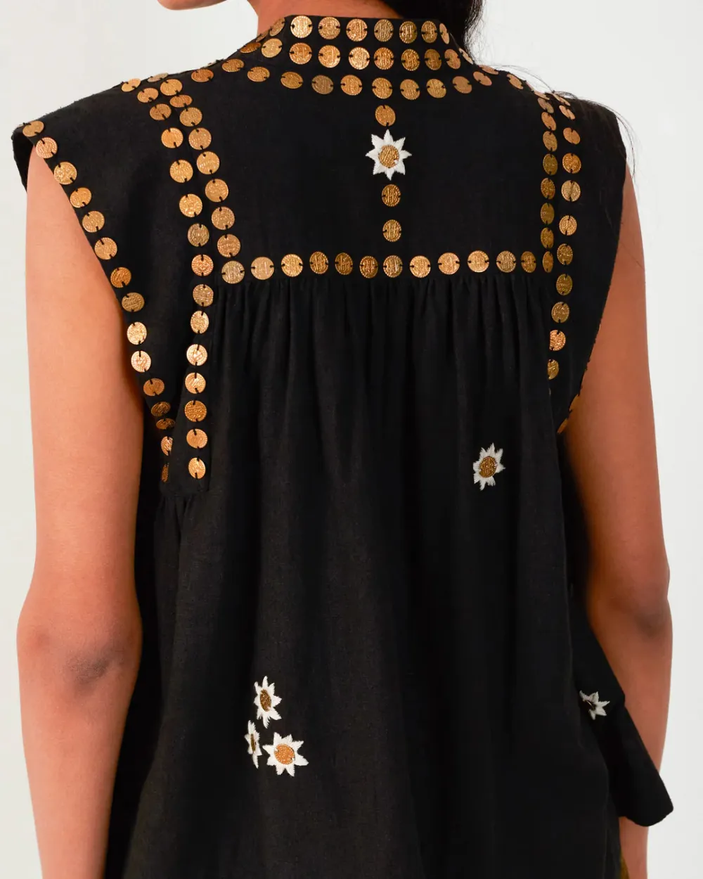 Crafted from sustainable silk, our black sleeveless top is embellished with hundreds of hand-stitched pressed gold coins along with a dash of hand-embroidered white daisies. The vintage-inspired top hits at the hip and can easily go from day to evening.