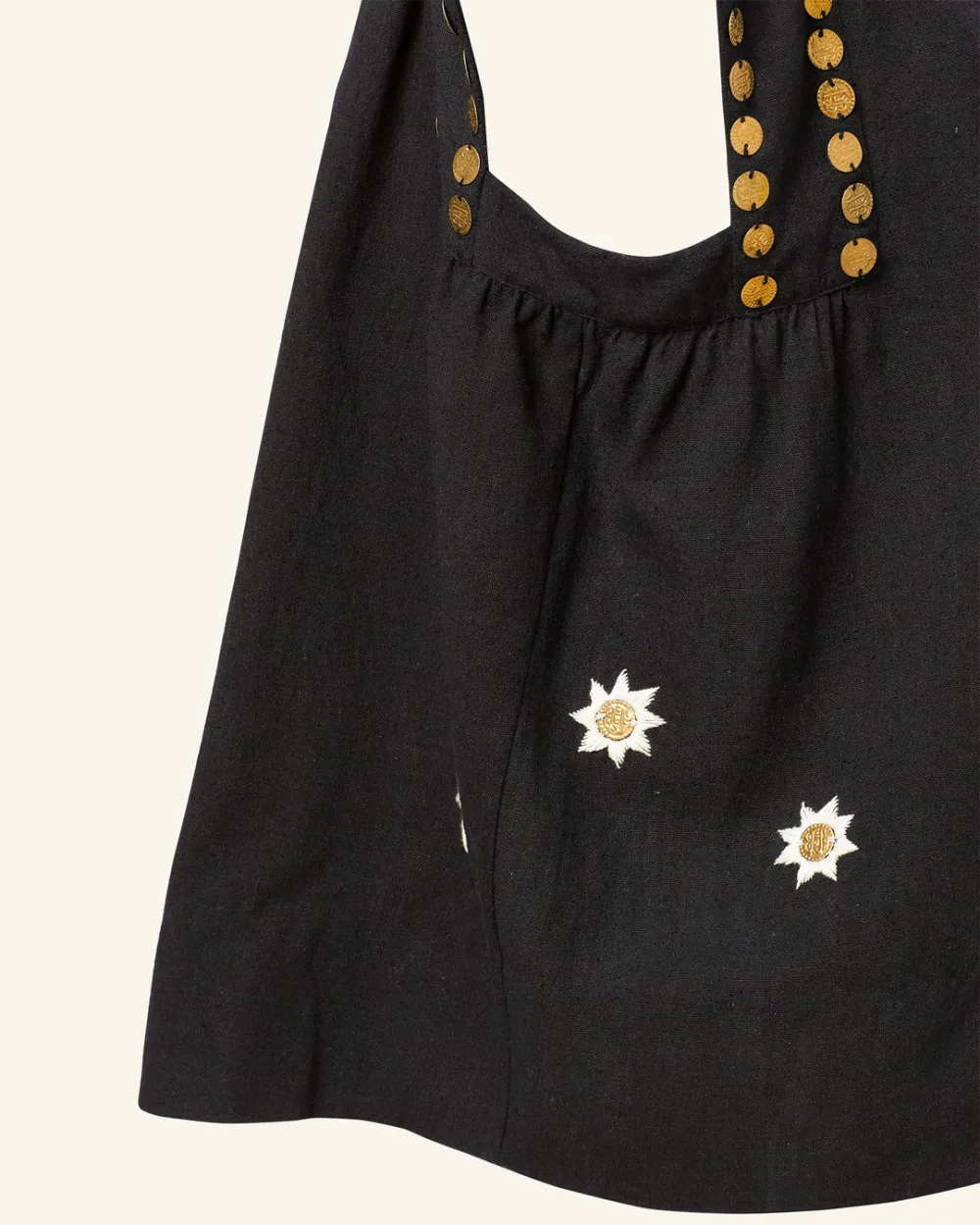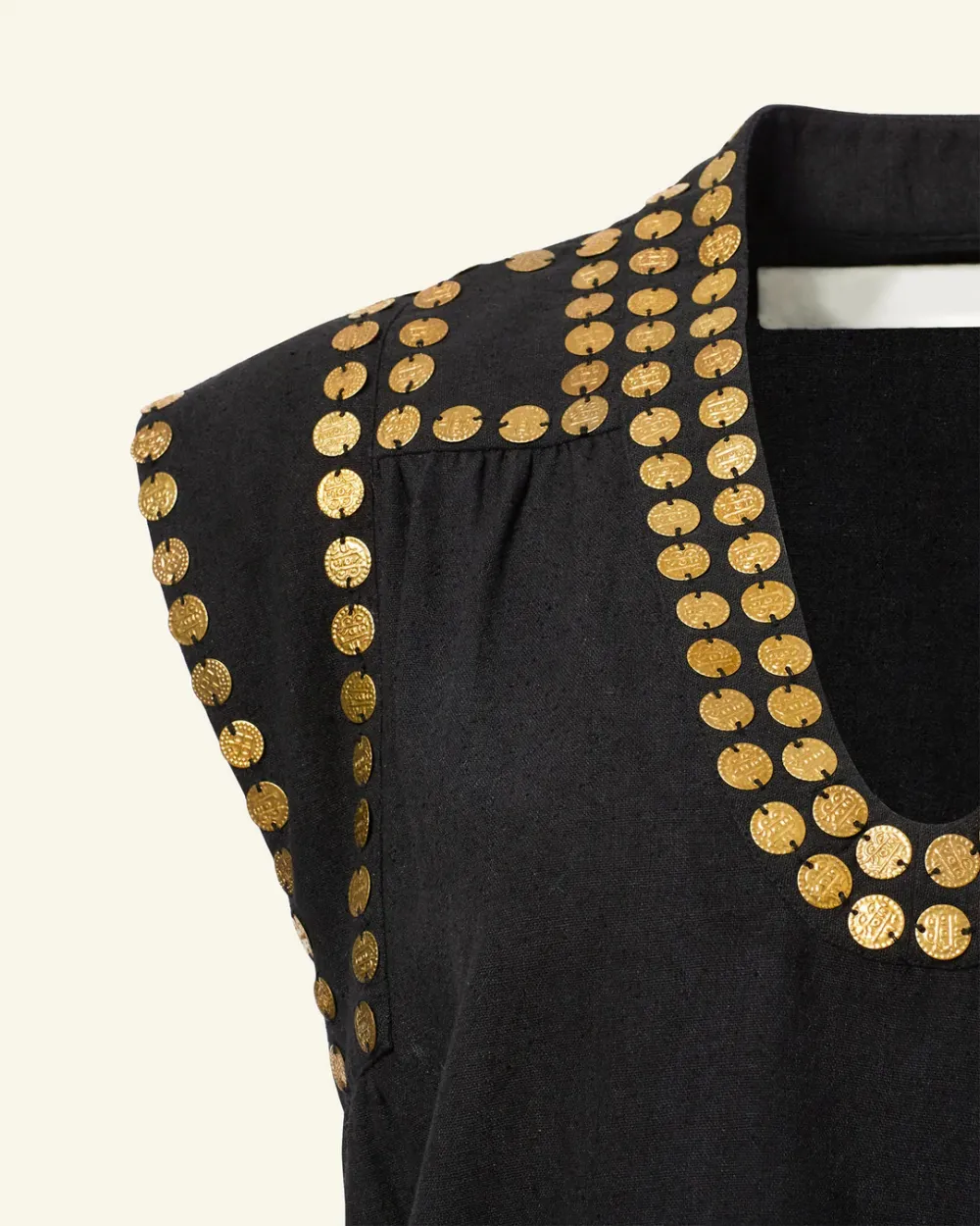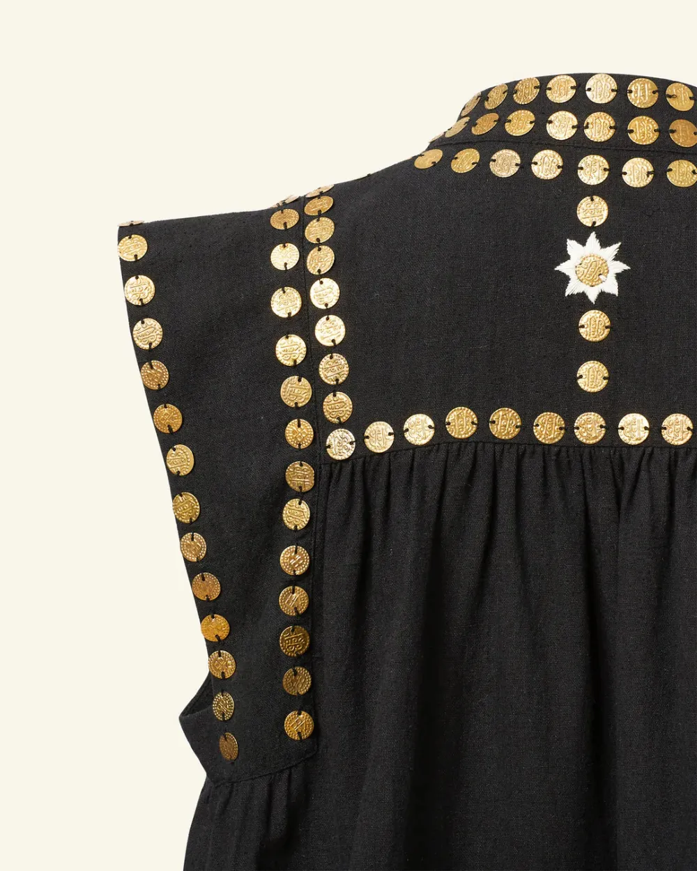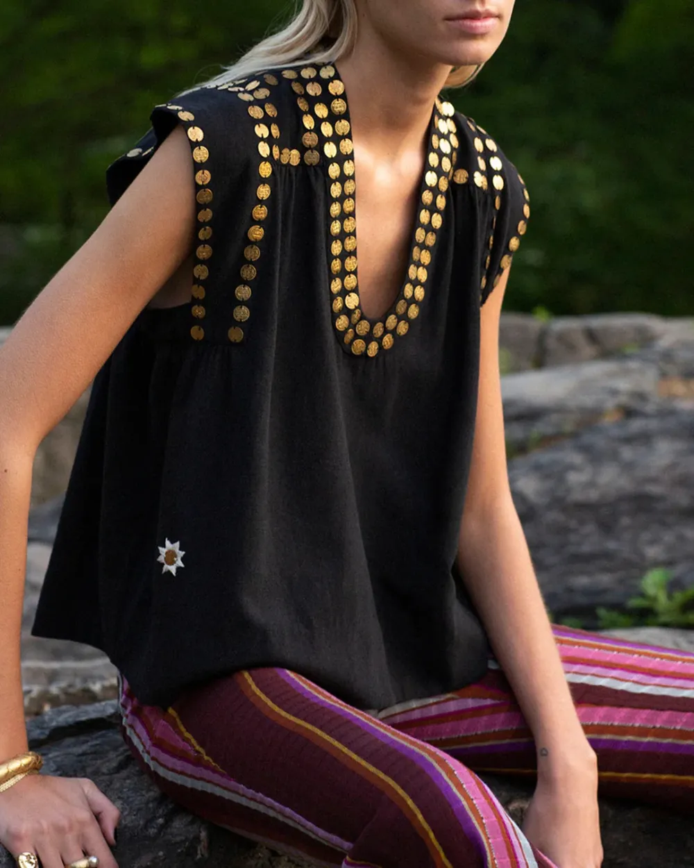 Crafted from sustainable silk, our black sleeveless top is embellished with hundreds of hand-stitched pressed gold coins along with a dash of hand-embroidered white daisies. The vintage-inspired top hits at the hip and can easily go from day to evening.