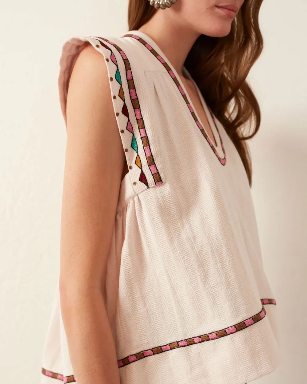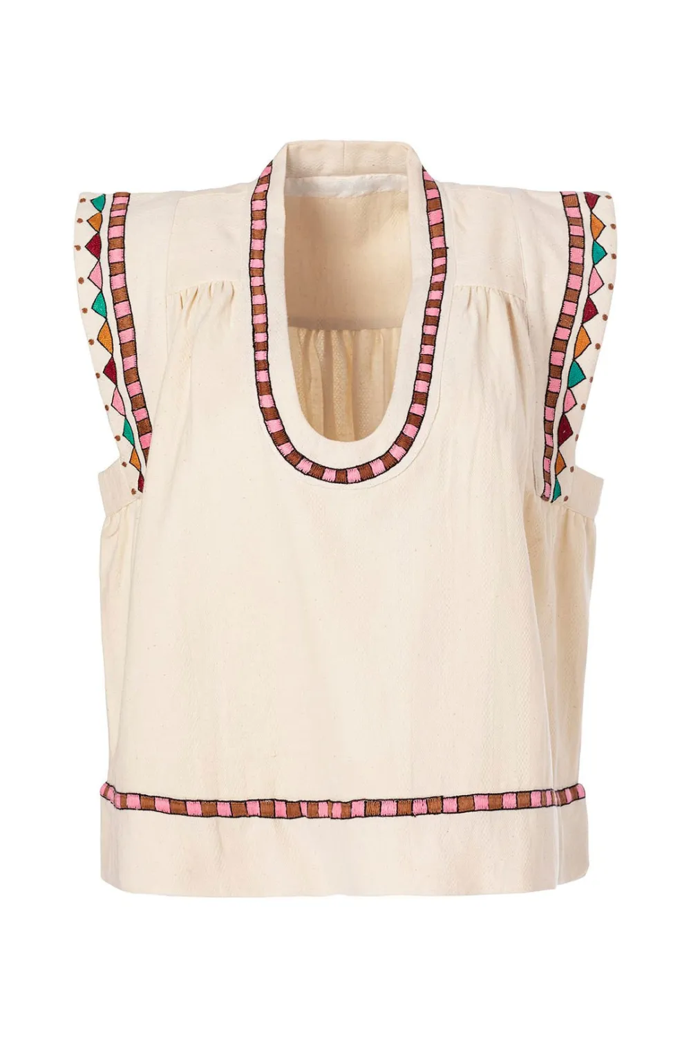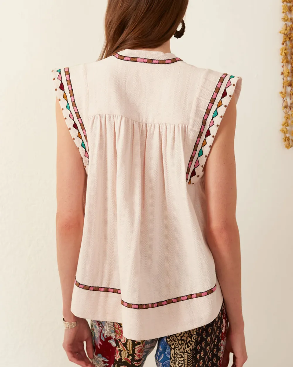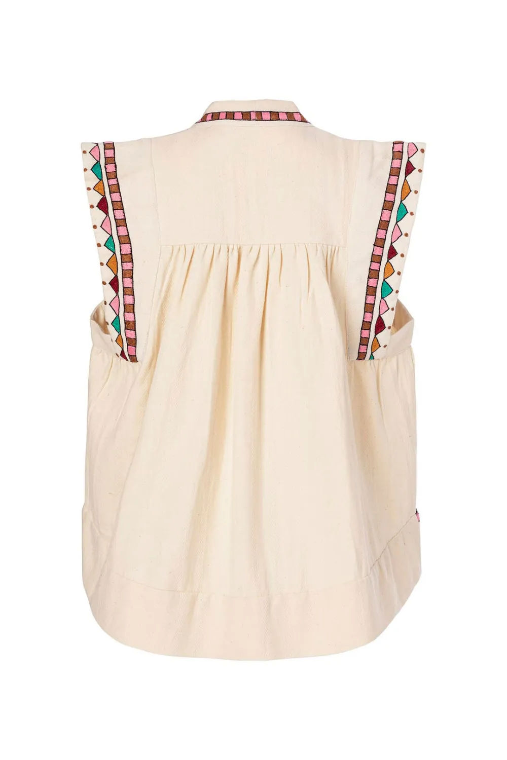 Sleeveless top rendered in cotton gauze, the Nehru has an easy fit, finished with hand embroidery along the edges of the shoulders.