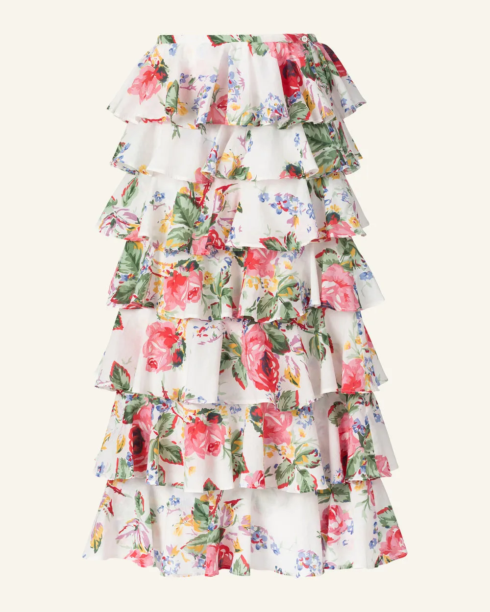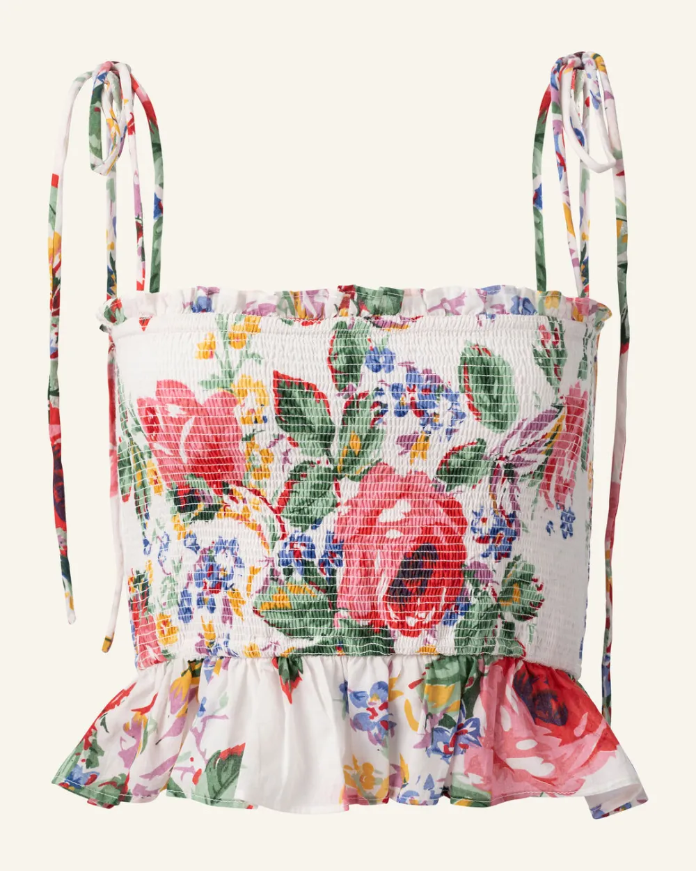 Crafted in block-printed cotton, our floral print top has a smocked bodice. Trimmed in small ruffles with adjustable tie straps, the cropped top can be paired with the matching Tasha Rose Ruffle Skirt.