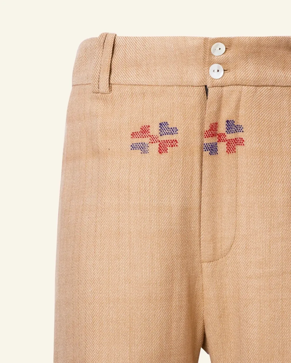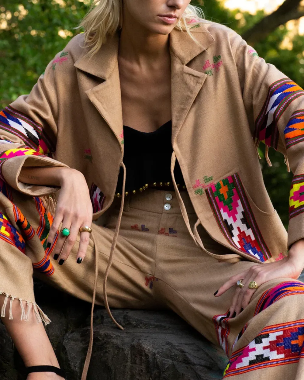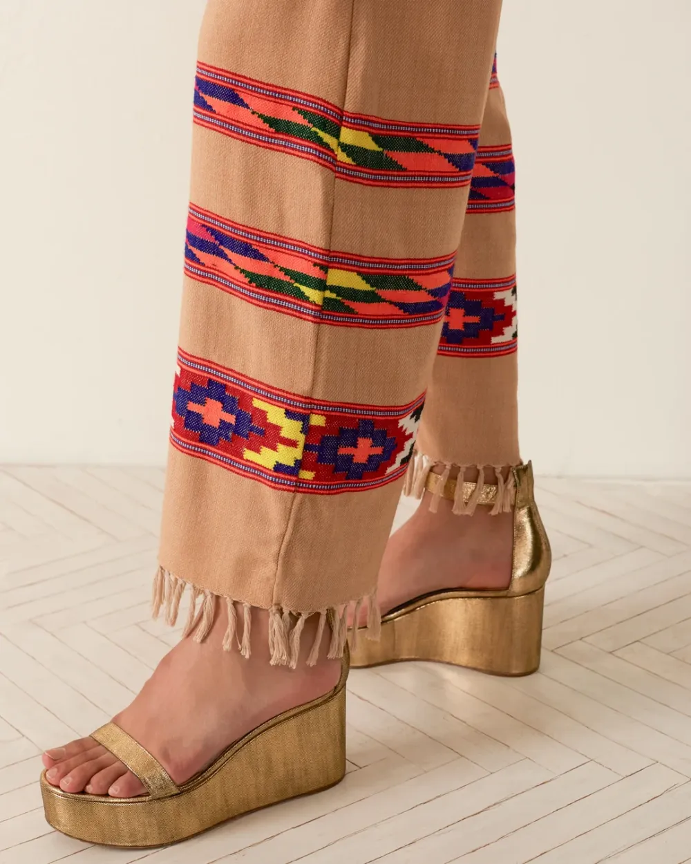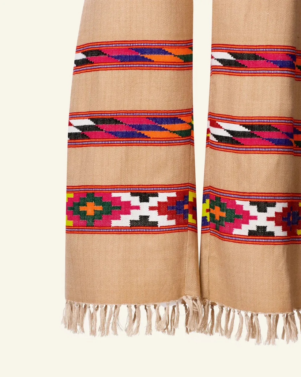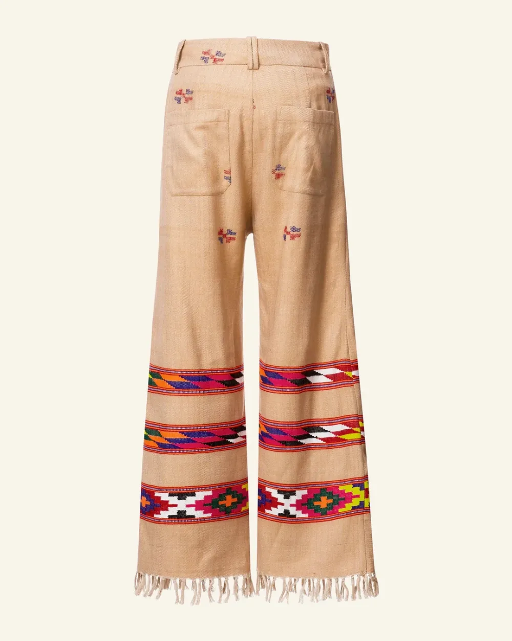 Crafted from wool, our tan pant is made from blankets woven by hand in Kullu, a town in the Himalayan foothills with a centuries-old weaving tradition. The straight-leg ankle pant has bands of colorful designs and a fringed hem. Pair the hand-finished pant with the matching Western Dune Blanket Jacket.