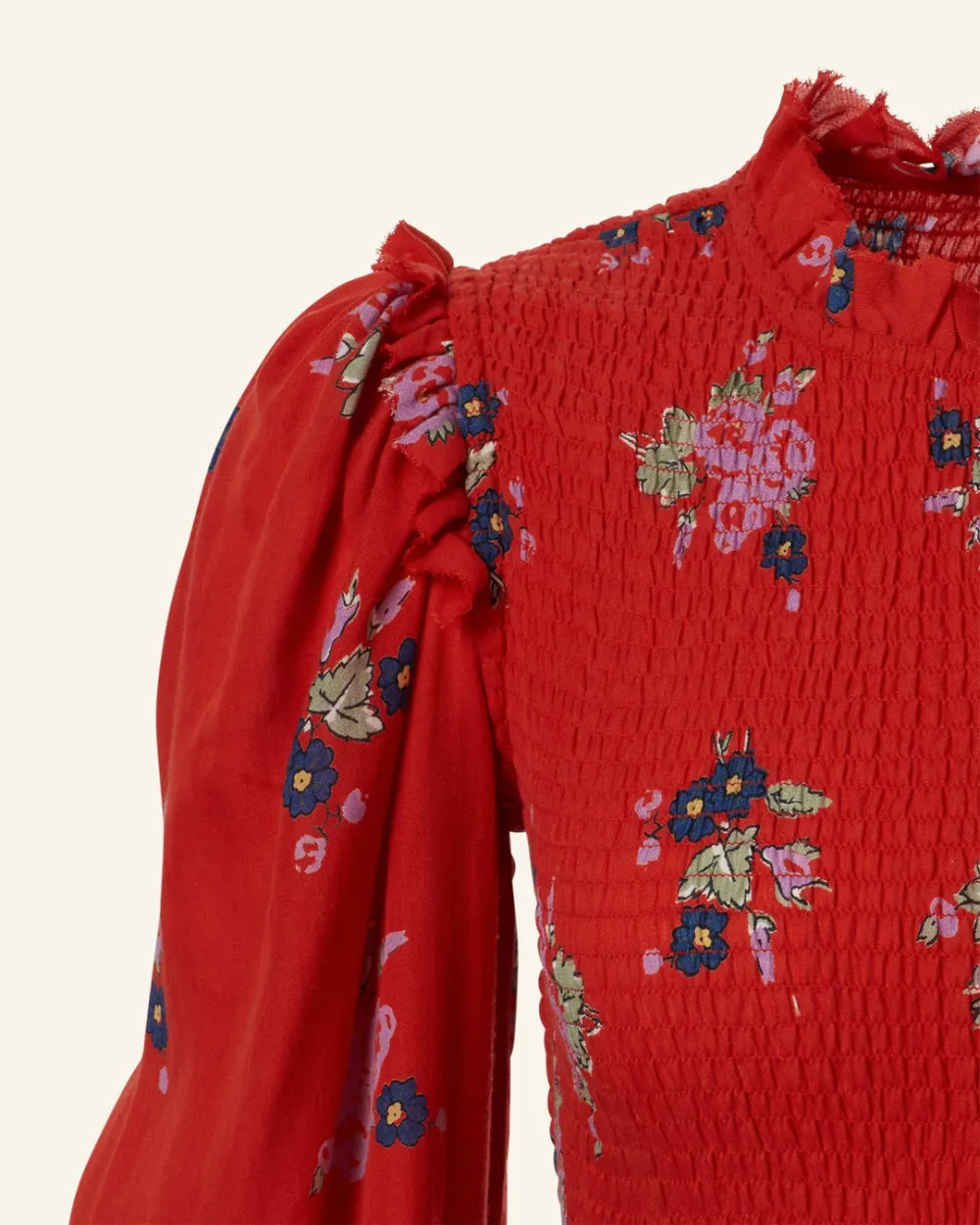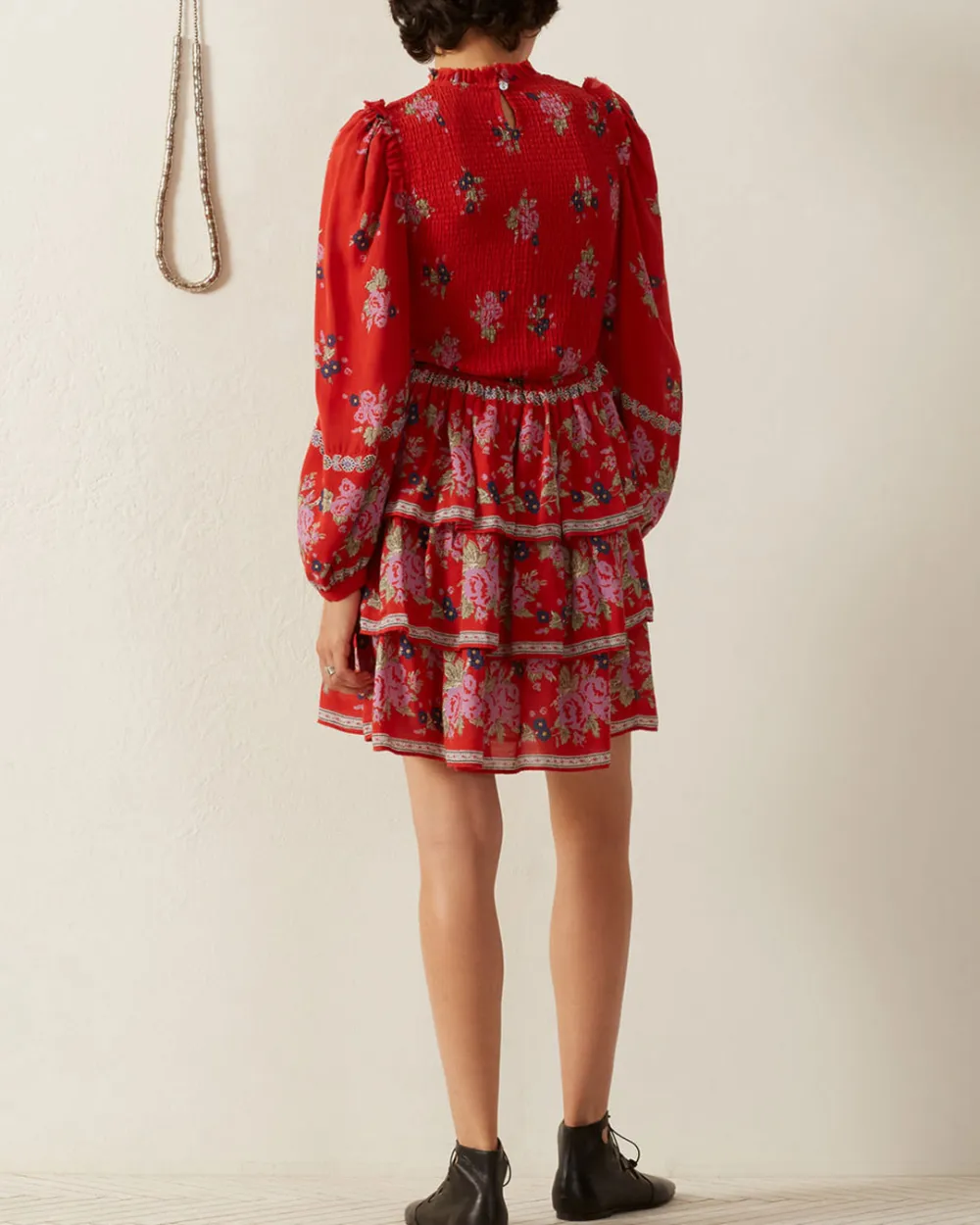 Crafted from Tencel, our red floral mini dress has a smocked bodice and ruffle-tiered skirt. The long-sleeved dres has micro ruffle trim along the neck and armholes. The hand-finished dress features a floral motif inspired by French chintz.