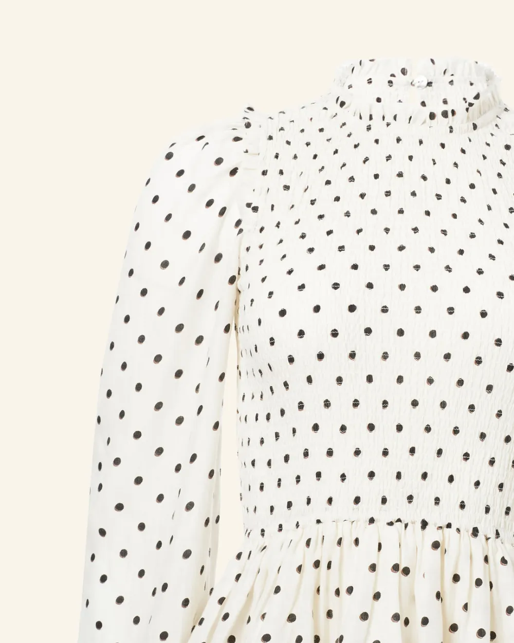 Cut from block-printed Tencel, our polka-dot print white dress has a smocked bodice and a ruffled-tier skirt. The long-sleeved dress has a micro ruffle trim along the neck. The perfect party dress, dress it up or down. Pairs well with a denim jacket.