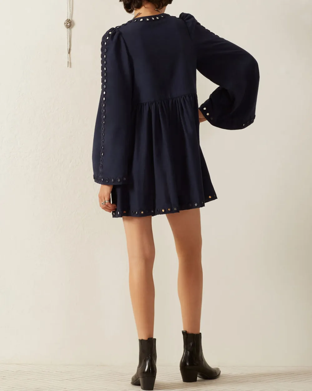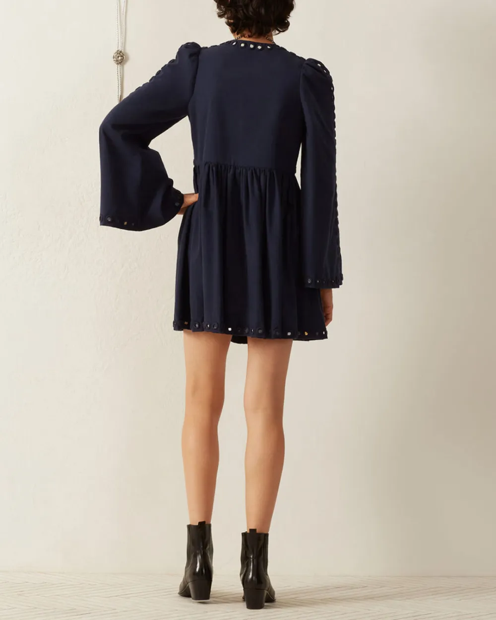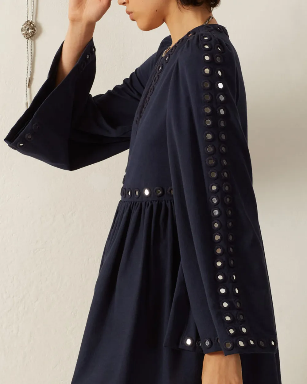 Crafted from Khadi cotton, our blue embellished dress has graceful bell sleeves and a short gathered skirt. The long-sleeved dress is hand-embroidered throughout with mirror work. Mirror work is the ancient craft of hand embroidering mirrors to textiles. The shimmering dress is lined at the bodice and hand finished.