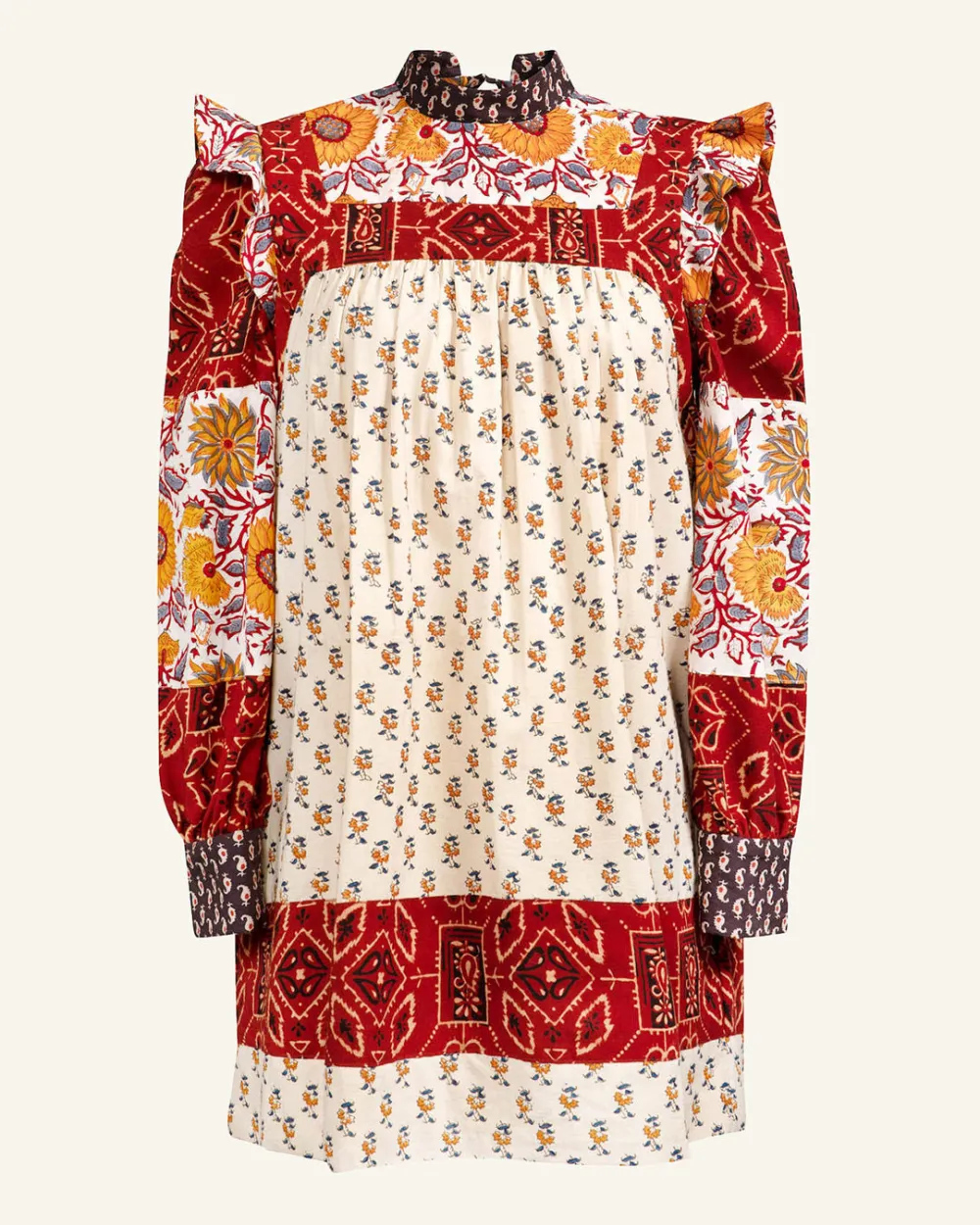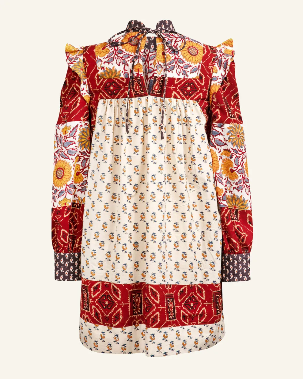 Four hand block printed complimentary textiles are patchworked together to create the Sofia. Gathered at the shoulder and wrist, and finished with a tie at at the back of the neck.