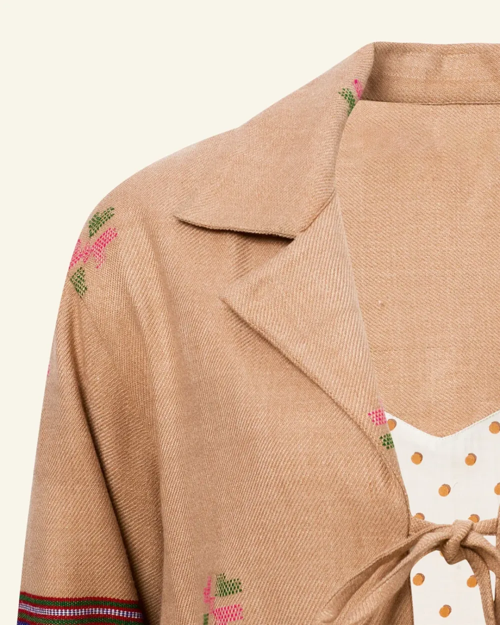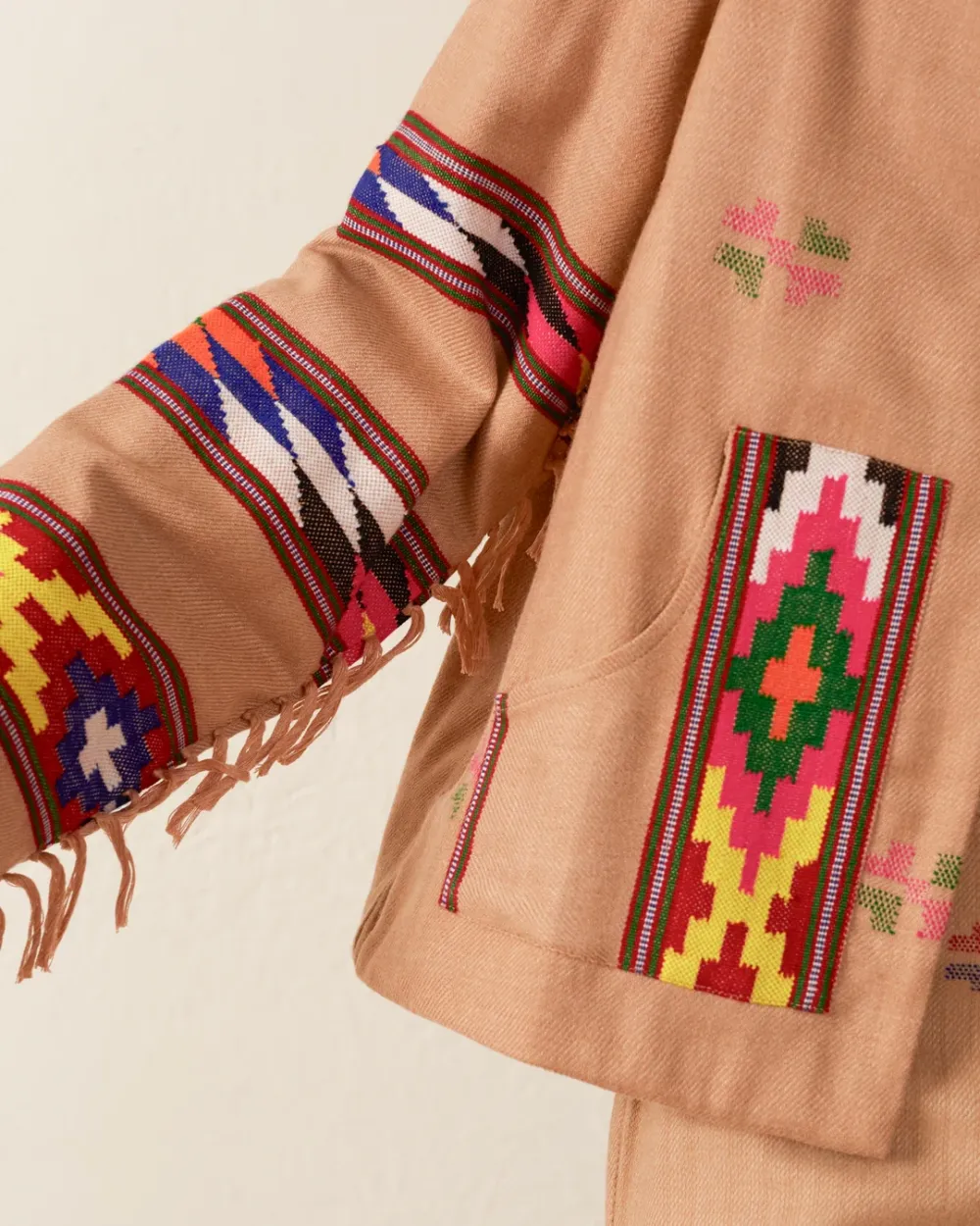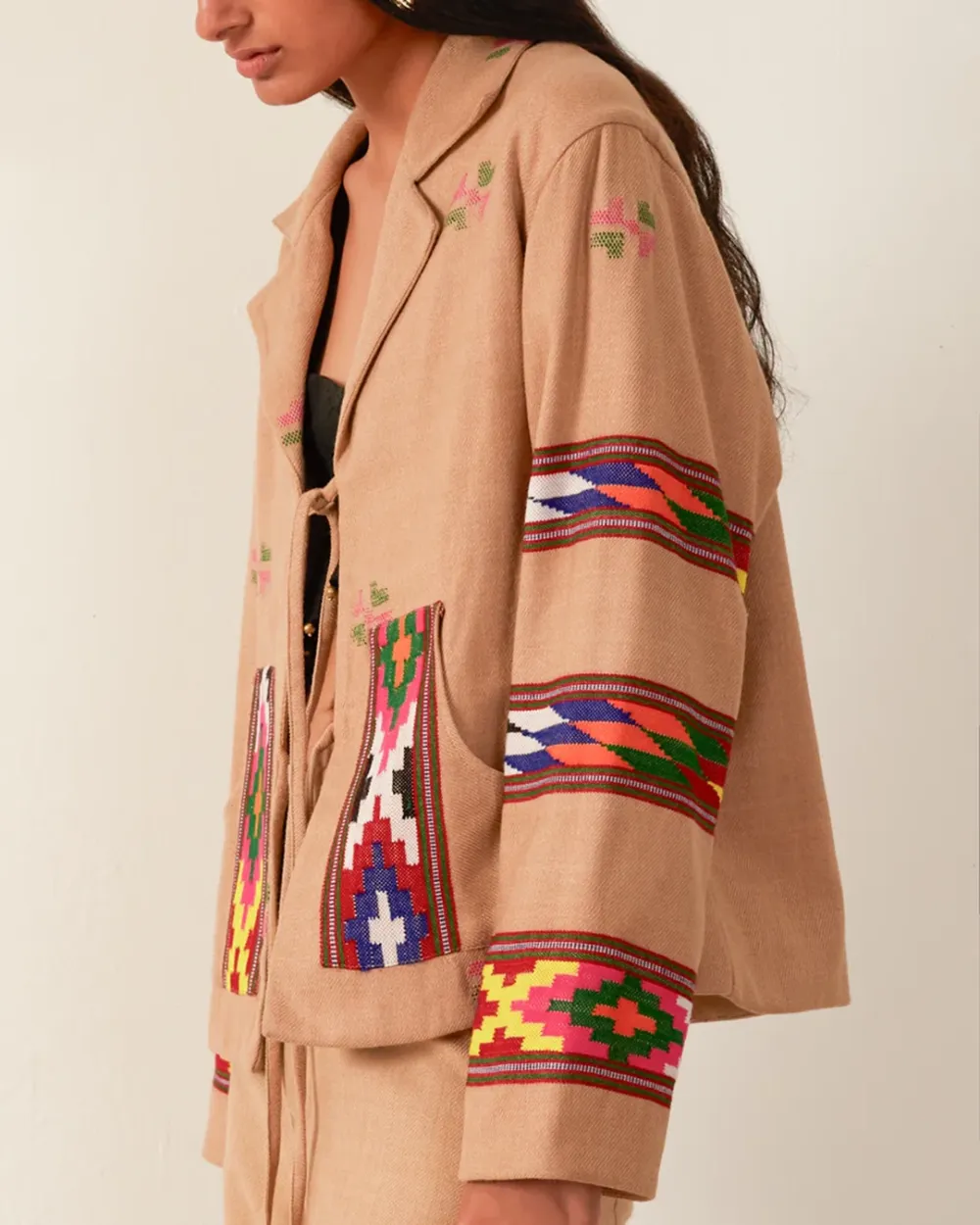 Crafted from wool, our tan jacket is made from blankets woven by hand in Kullu, a town in the Himalayan foothills with a centuries-old weaving tradition. The oversized jacket has dropped shoulders, front-tie closures, and a cotton-silk lining. Pair the hand-finished jacket with the matching Scout Dune Blanket Pant.