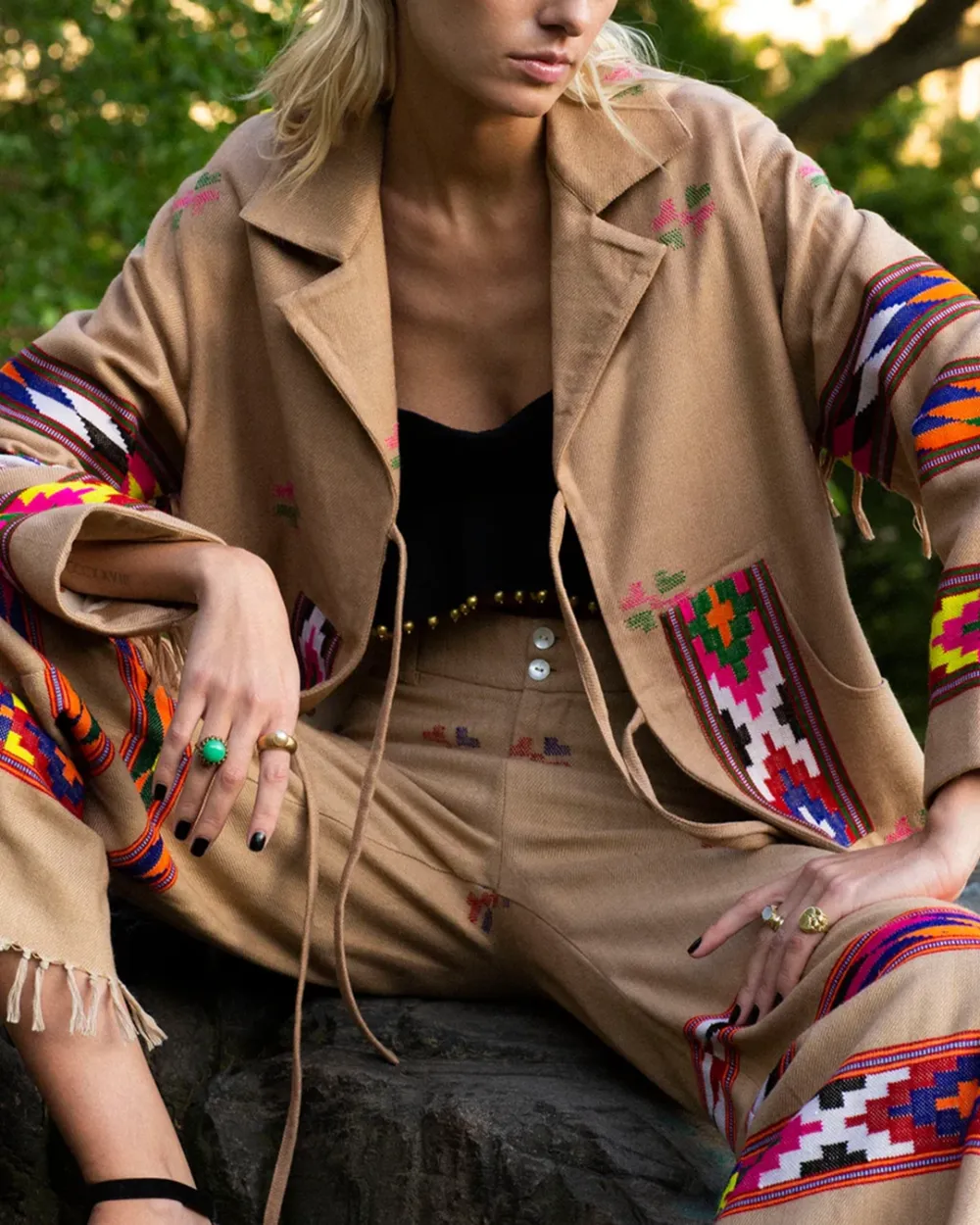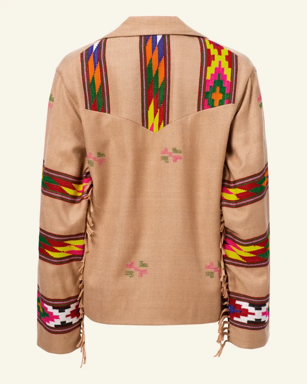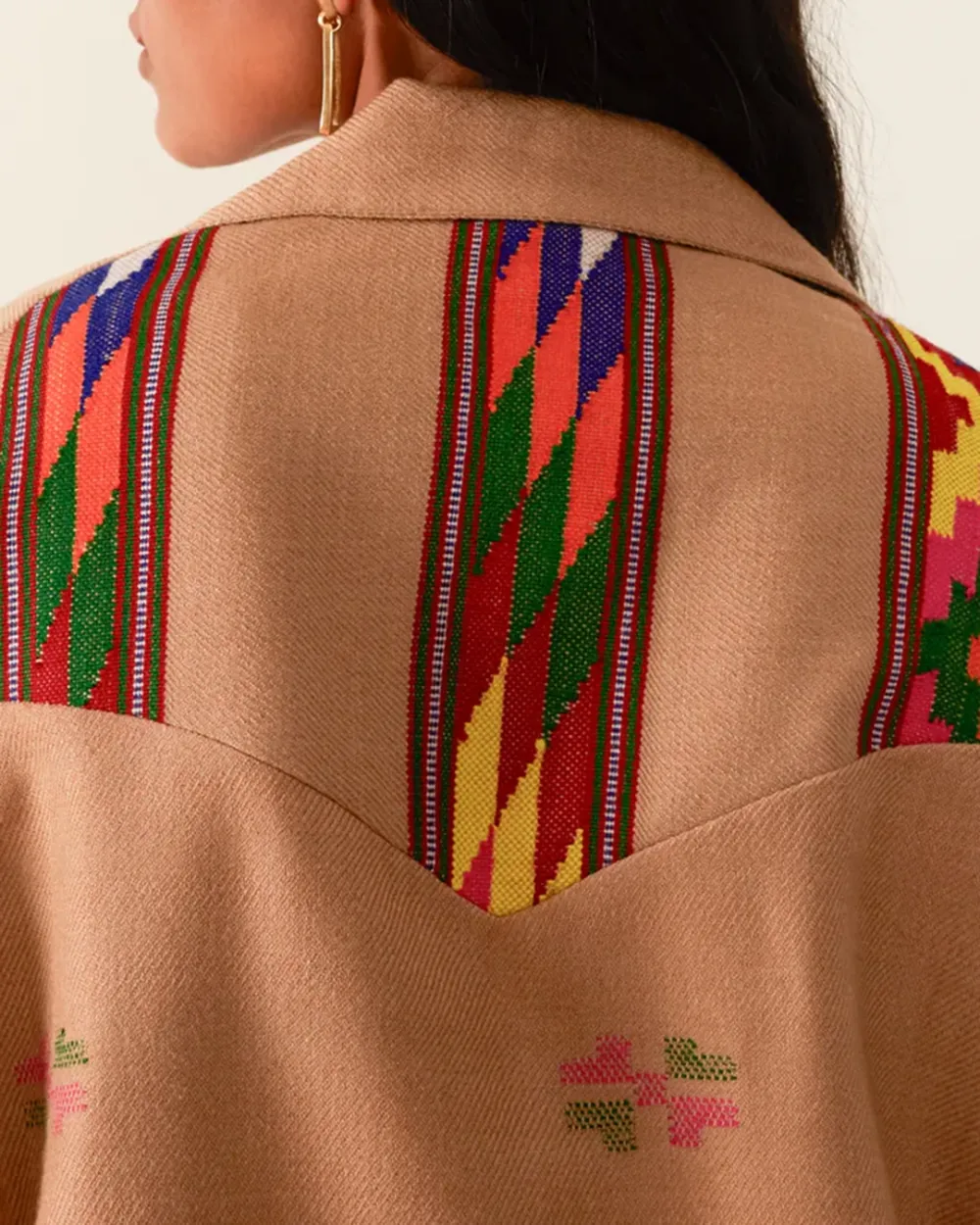 Crafted from wool, our tan jacket is made from blankets woven by hand in Kullu, a town in the Himalayan foothills with a centuries-old weaving tradition. The oversized jacket has dropped shoulders, front-tie closures, and a cotton-silk lining. Pair the hand-finished jacket with the matching Scout Dune Blanket Pant.