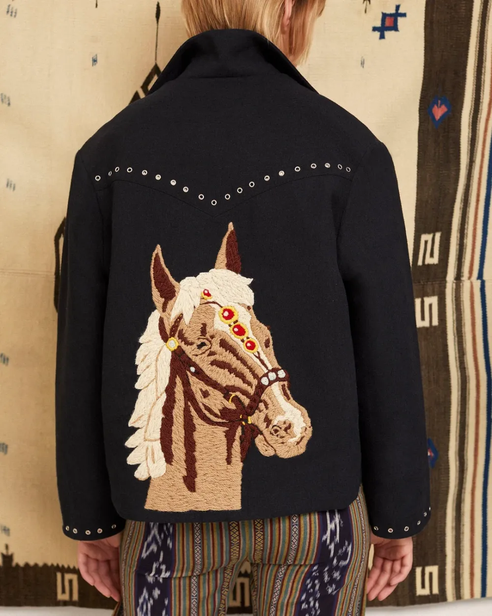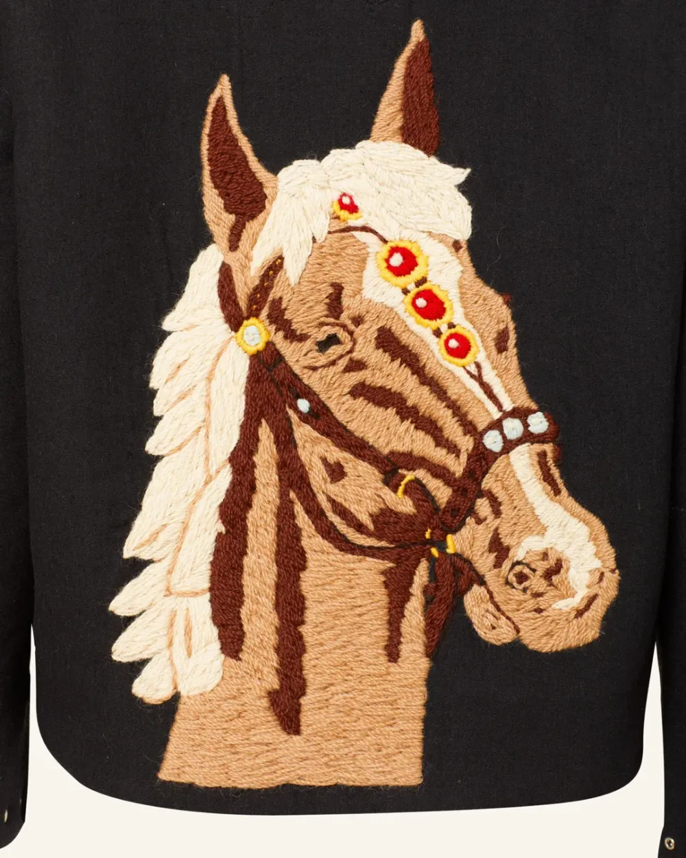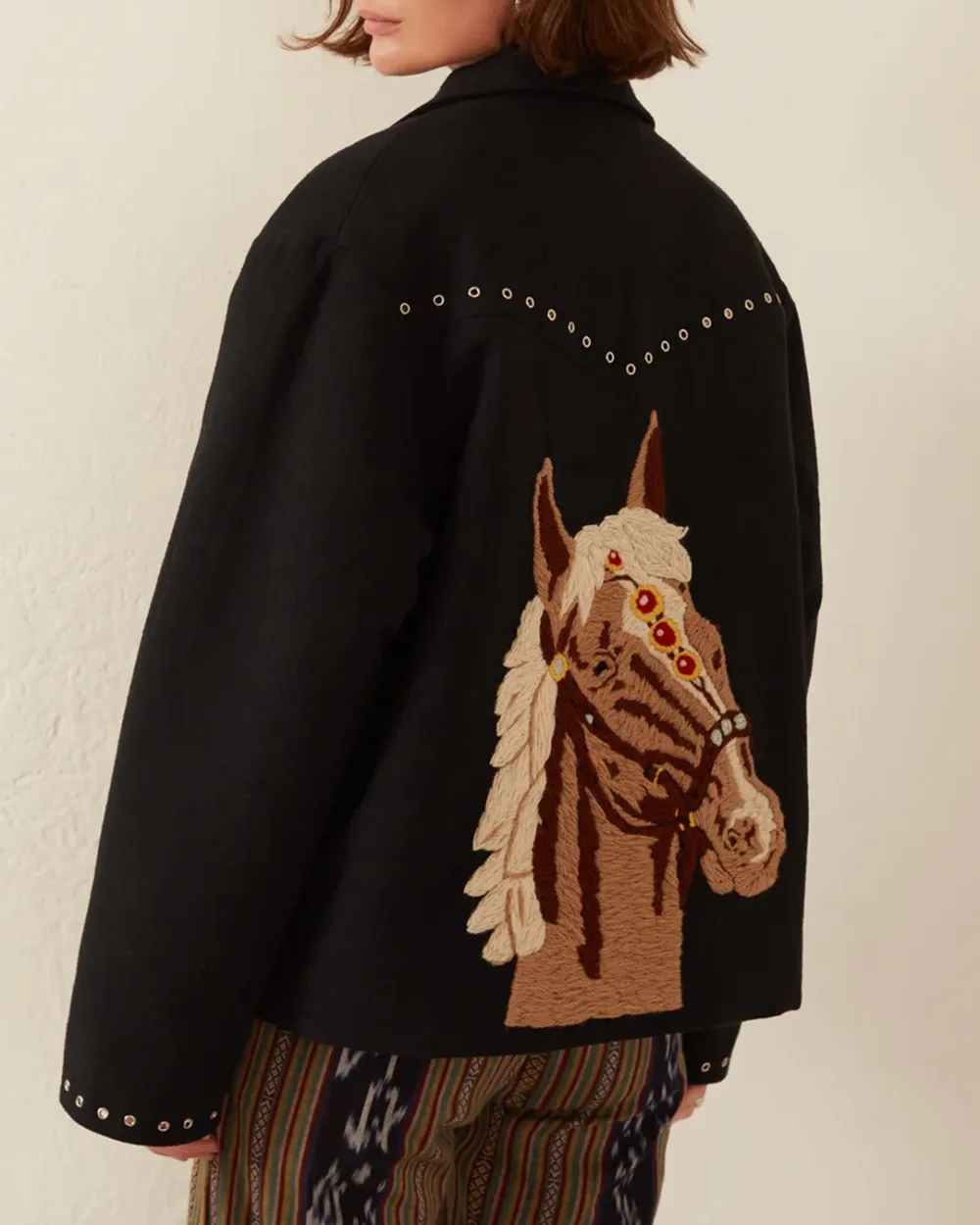 Crafted from Indian slubbed silk, our Western-inspired rodeo jacket is hand-embroidered with a horse motif and lined with metal grommet details. The silk equine jacket has a peak lapel, dropped shoulders, and an easy fit. A great transition piece between seasons.