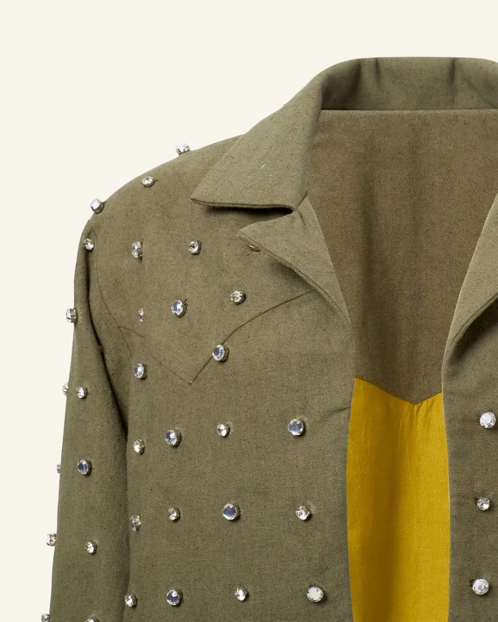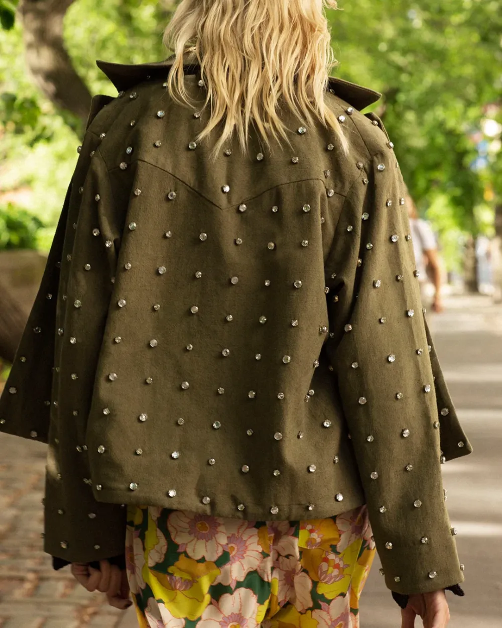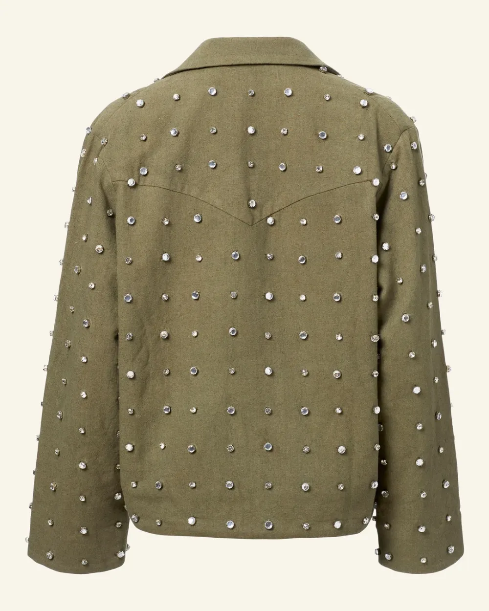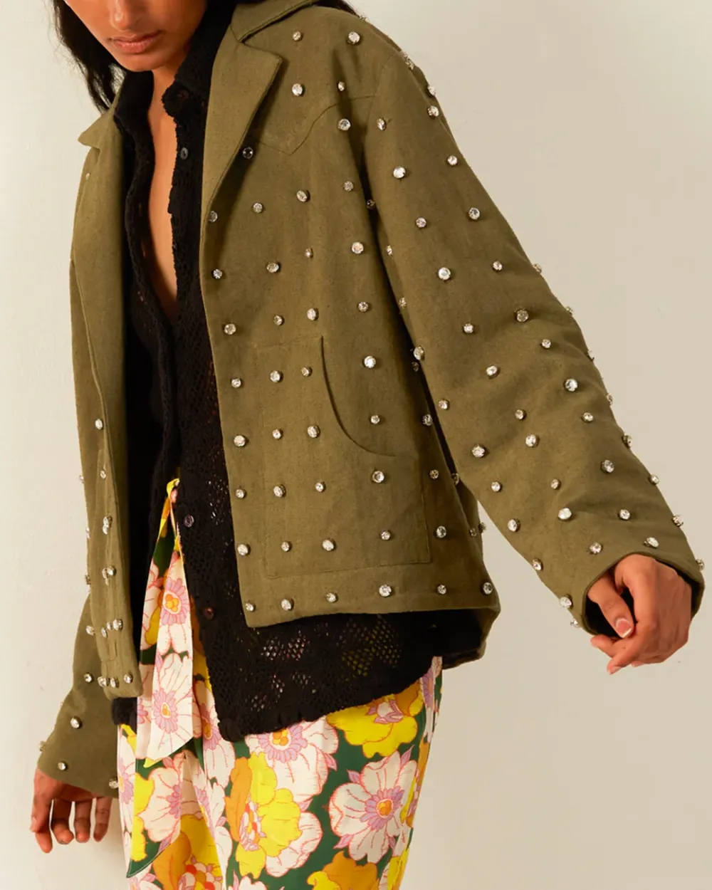 Crafted from slubbed silk, our army green boyfriend jacket has dropped shoulders, patch pockets, and an easy fit. The crystal-embellished jacket is studded throughout with large sparkling diamantés. A great transition piece between seasons.