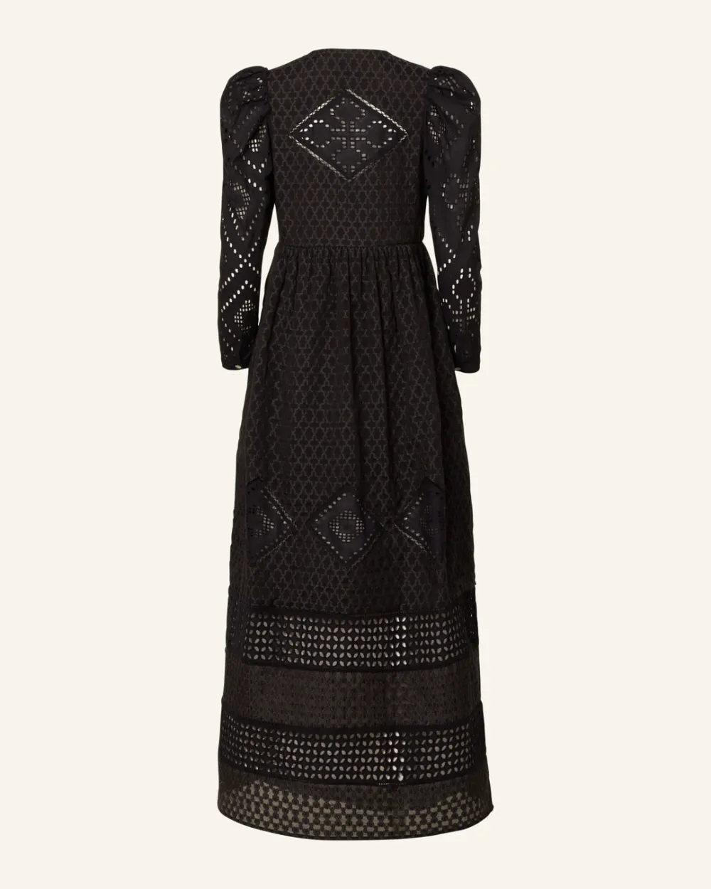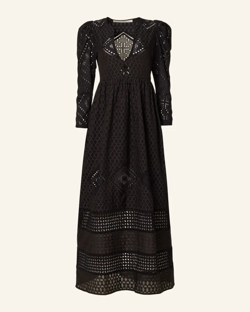 Crafted from cotton eyelet, our hand-embroidered black prairie dress has a romantic silhouette and long sleeves. Eyeleted with diamond-shaped designs, the long dress features hand-stitched fagoting, gathered skirt, and a V-neckline. One of our favorite fits and easy to wear.