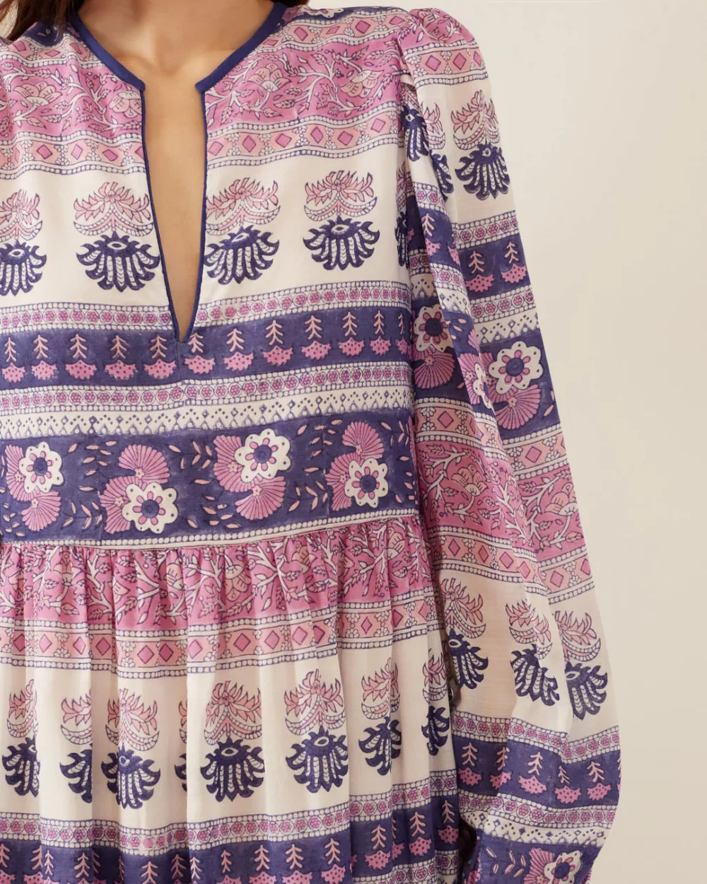 Block-printed by hand, our purple floral print prairie dress has a romantic silhouette and long sleeves. The cotton meadow dress has a V-neckline, long sleeves, and a gathered skirt. One of our favorite fits and easy to wear.