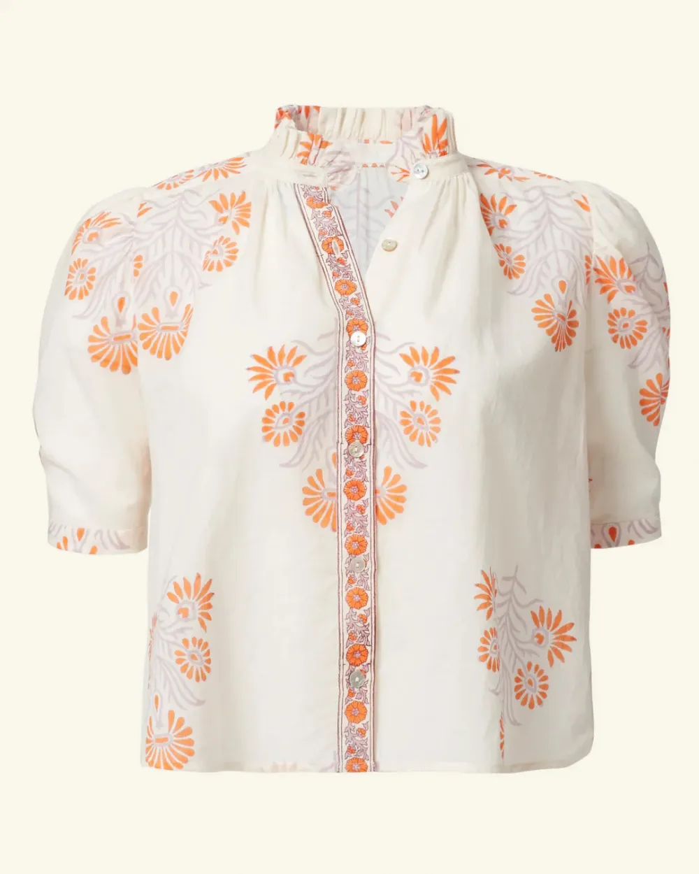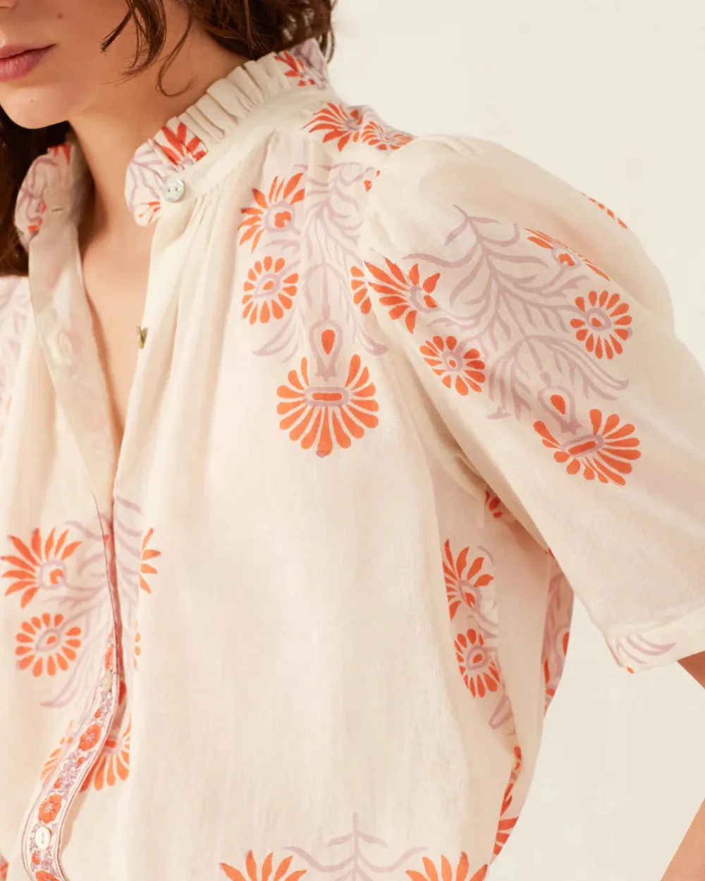 Individually cut by hand and finished with French seams, our floral motif shirt has short puffed sleeves, a ruffled collar, and a mother-of-pearl button front. Crafted from a lightweight cotton voile, the ’70s vintage-inspired shirt has a border-print button placket and a semi-sheer texture in the swaths of white.