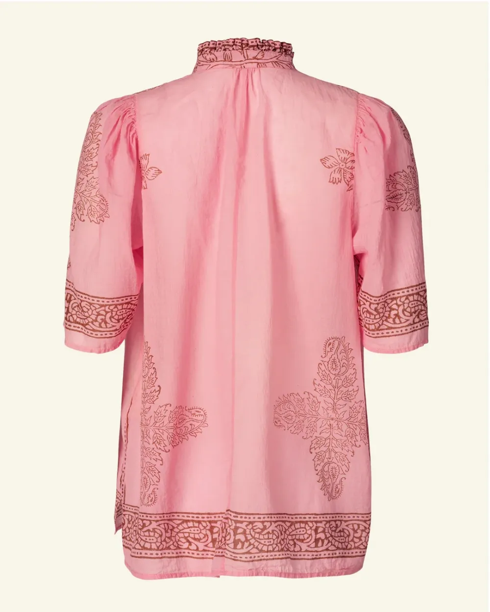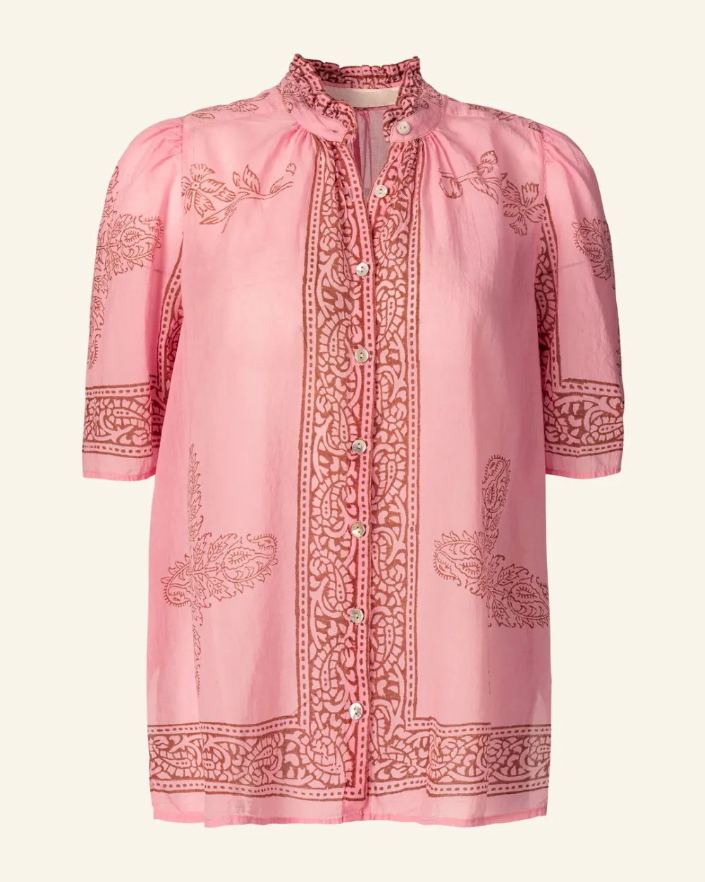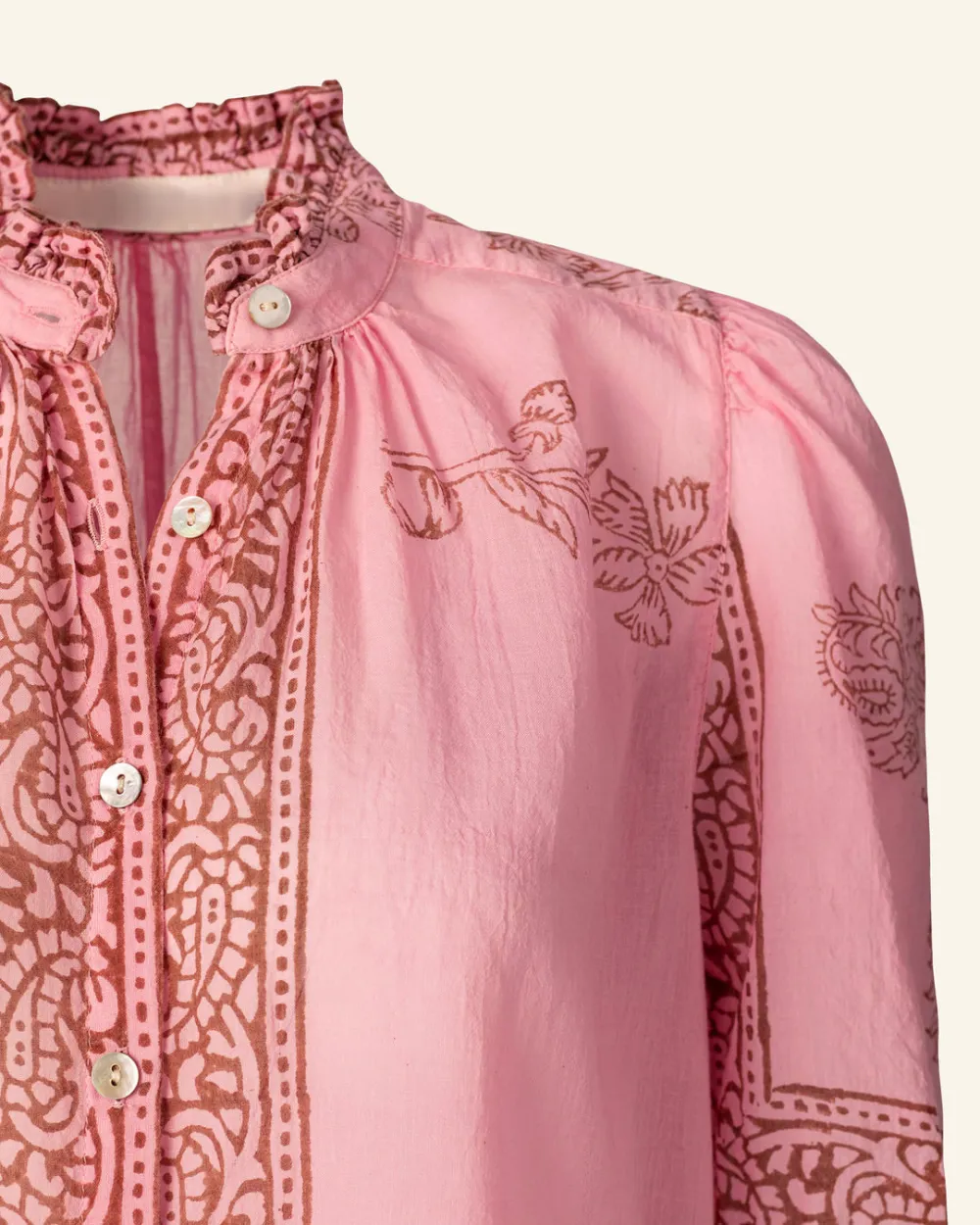Block-printed by hand, our cotton shirt has puffed sleeves and a ruffled collar. The shirt has a mother-of-pearl button front. The shirt has a sheer quality that is great for warmer weather. If you love the Winnie, try the Annabel Shirt, which is the same cut with long sleeves.