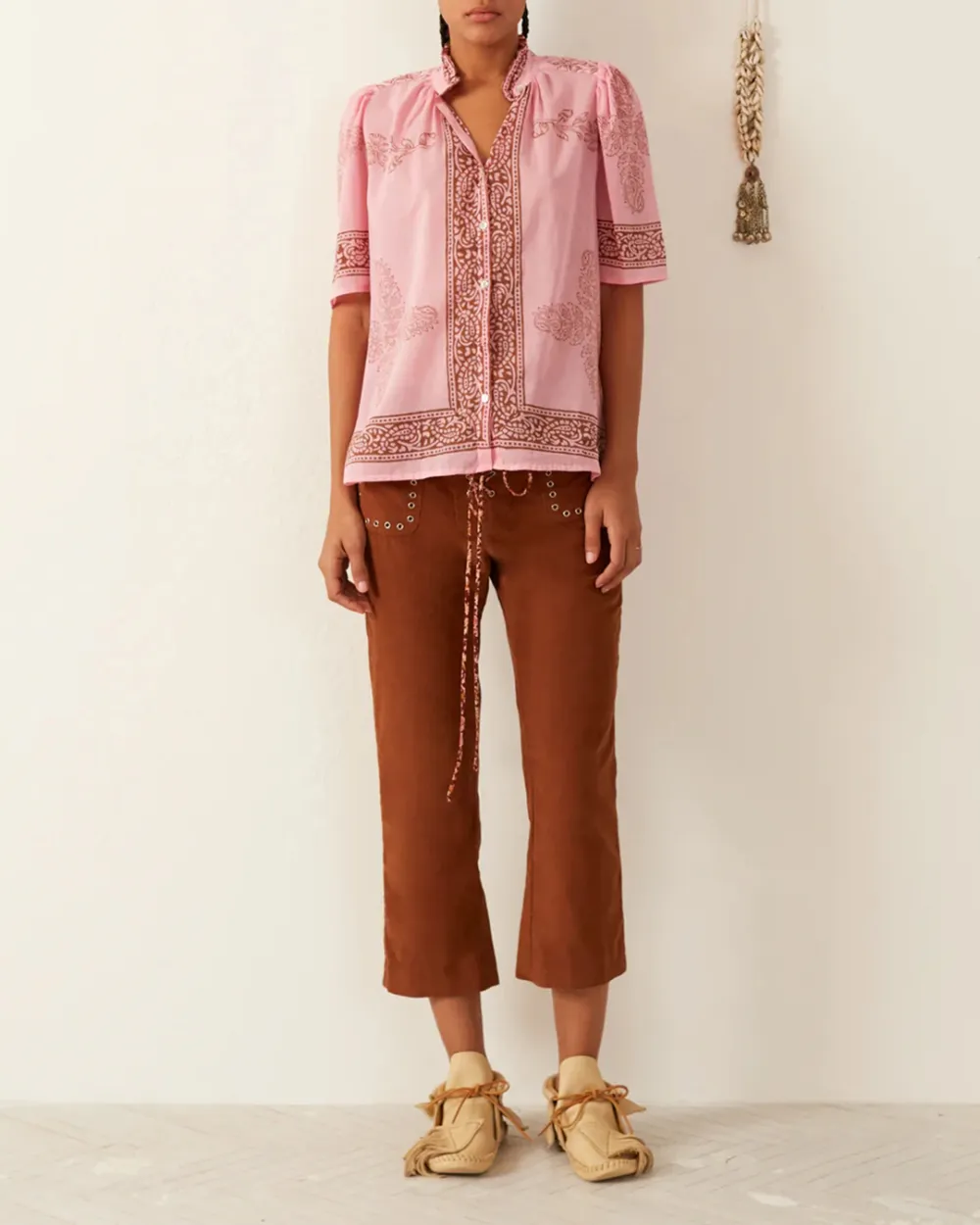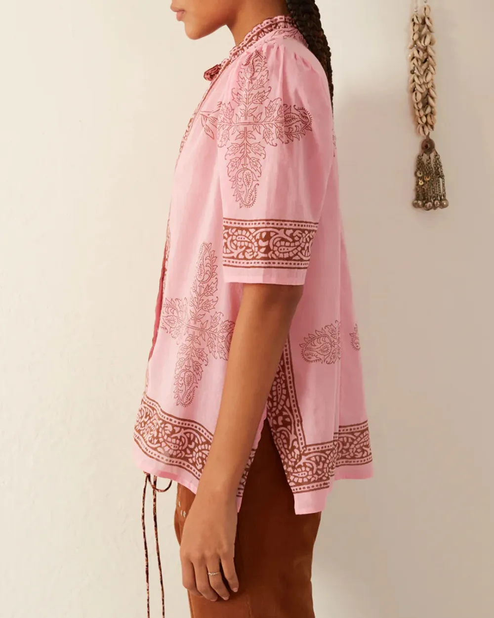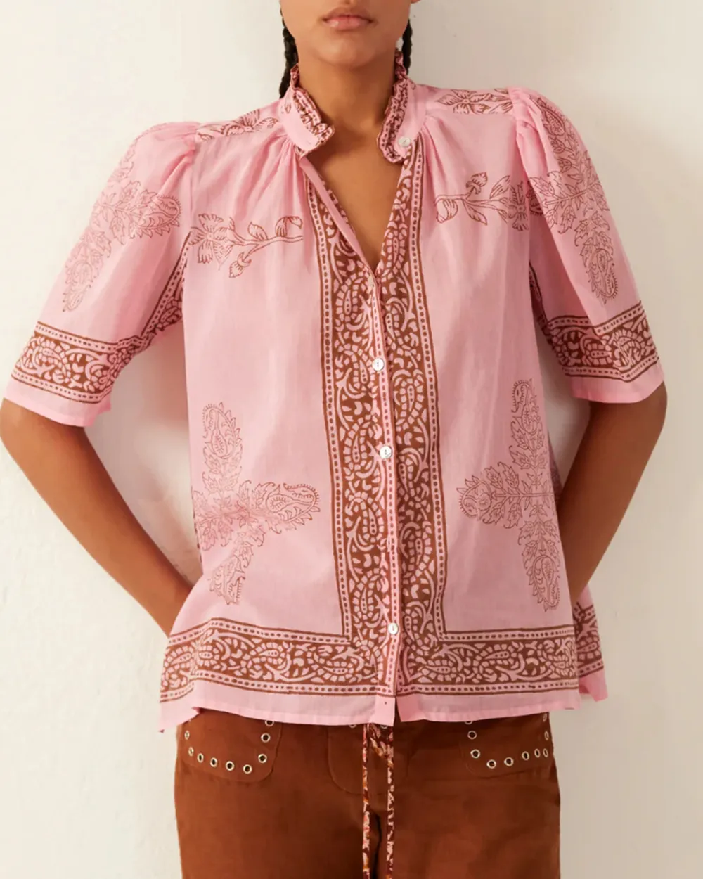 Block-printed by hand, our cotton shirt has puffed sleeves and a ruffled collar. The shirt has a mother-of-pearl button front. The shirt has a sheer quality that is great for warmer weather. If you love the Winnie, try the Annabel Shirt, which is the same cut with long sleeves.