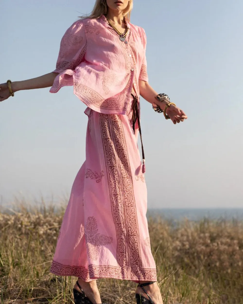 This one-of-a-kind textile was block-printed by hand. Subtle printing and dye variations are part of the unique beauty of the garment and a signature of the artisan’s hand.