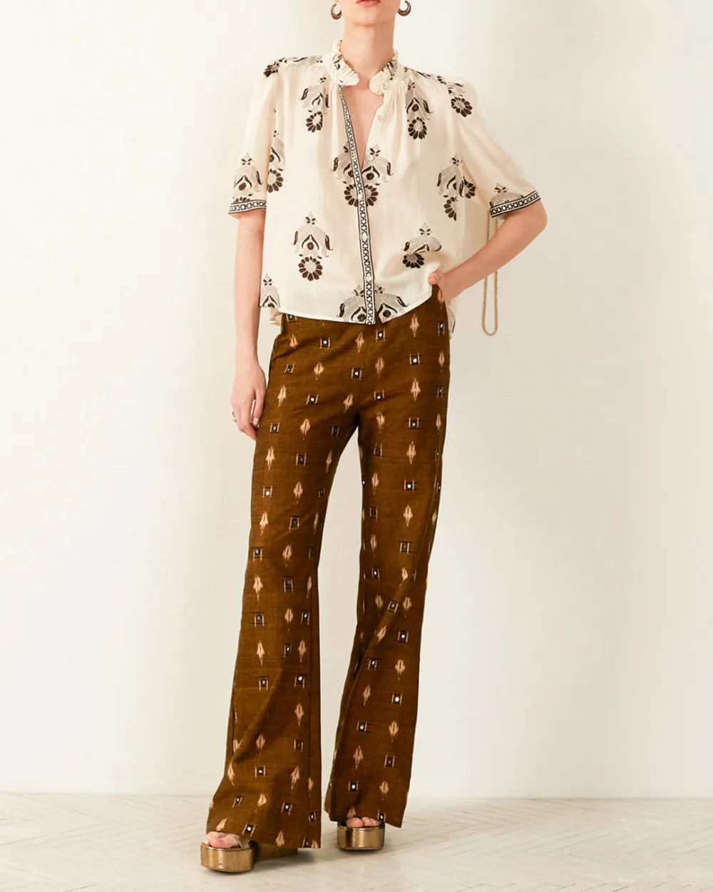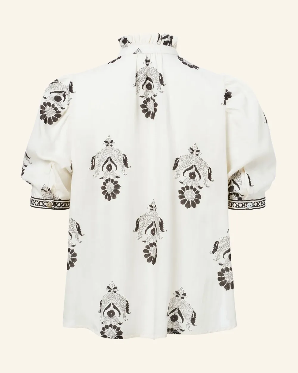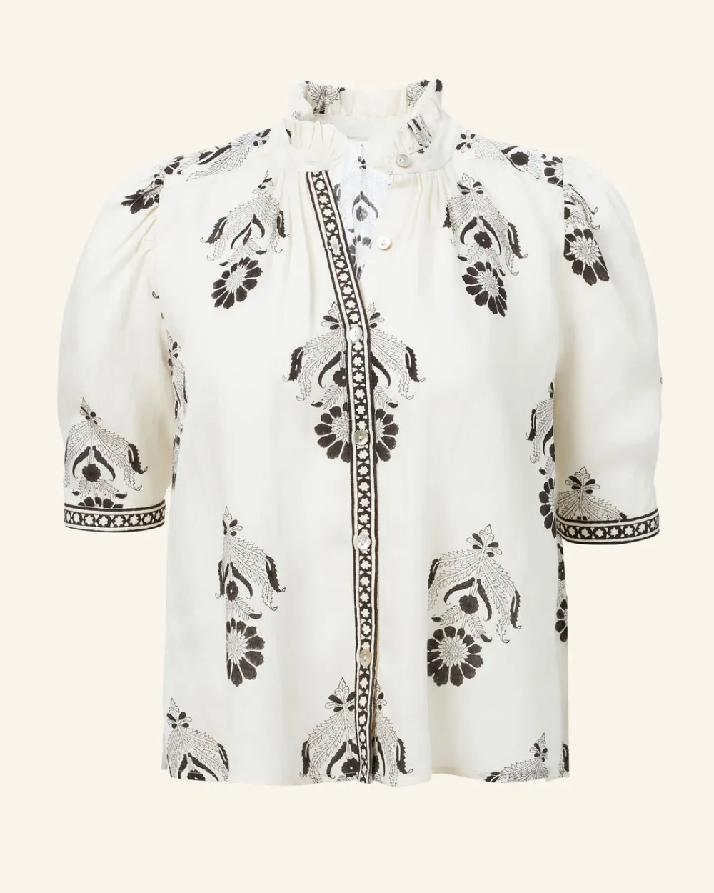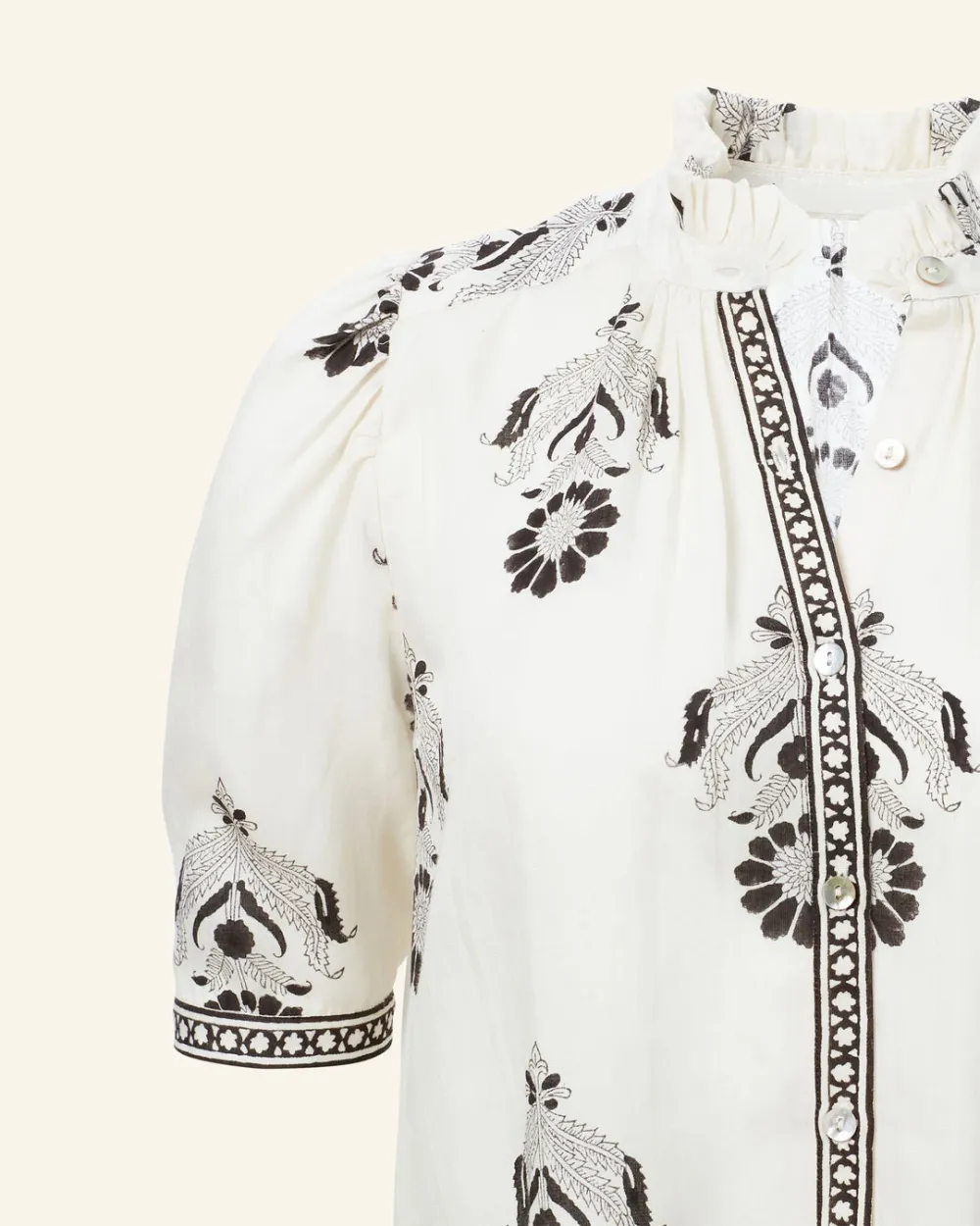 Individually cut by hand and finished with French seams, our floral motif shirt has short puffed sleeves, a ruffled collar, and a mother-of-pearl button front. Crafted in Tencel, a soft natural fiber, the vintage-inspired shirt is hand-block printed with falling blooms and a border-print button placket and cuffs. This is a shorter version of the Winnie.